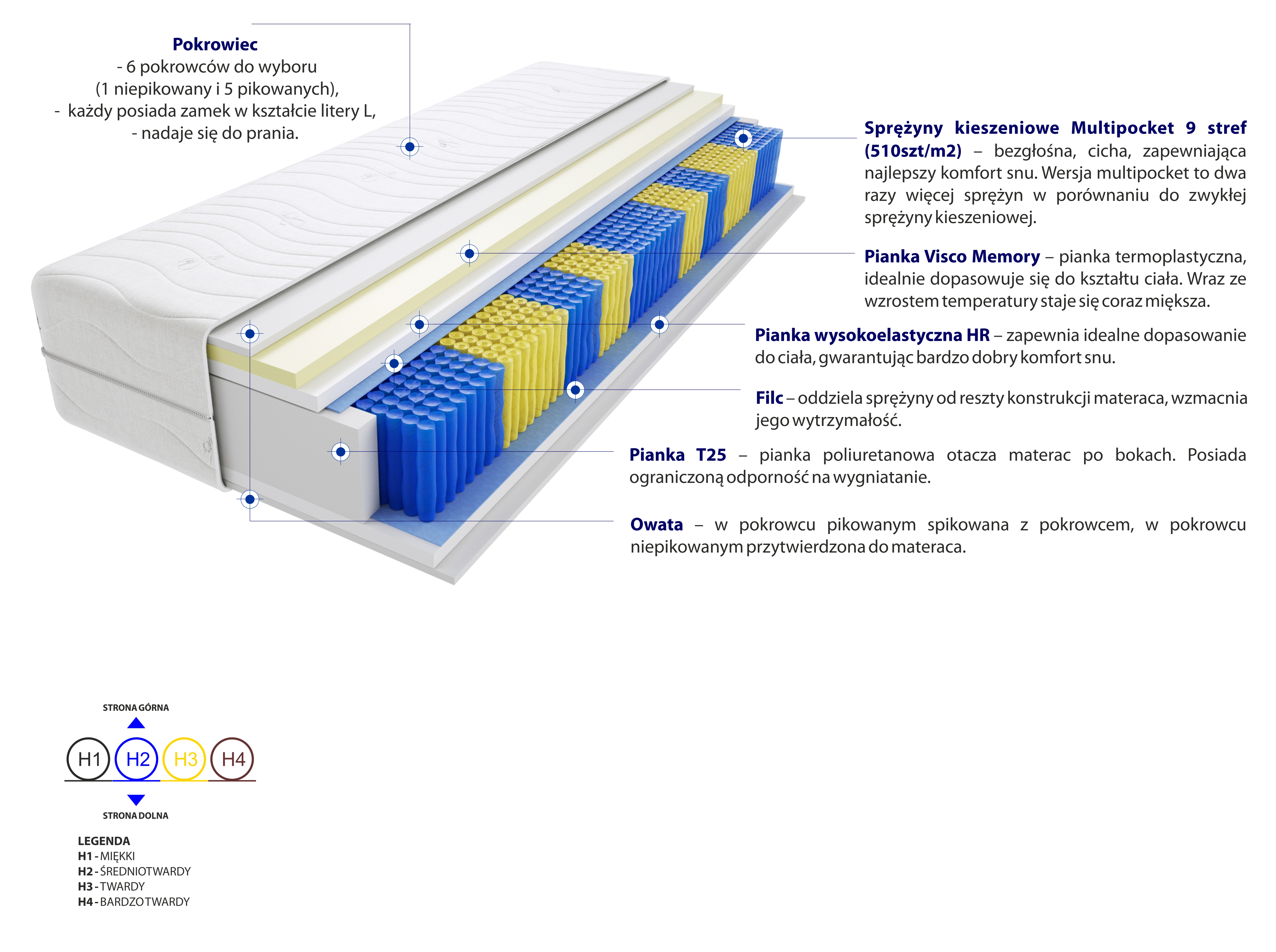 Filc, Pianka T25, Pianka Visco Memory, Pianka wysokoelastyczna HR, Pokrowiec, Sprężyny kieszeniowe Multipocket, Włókno klimatyzujące