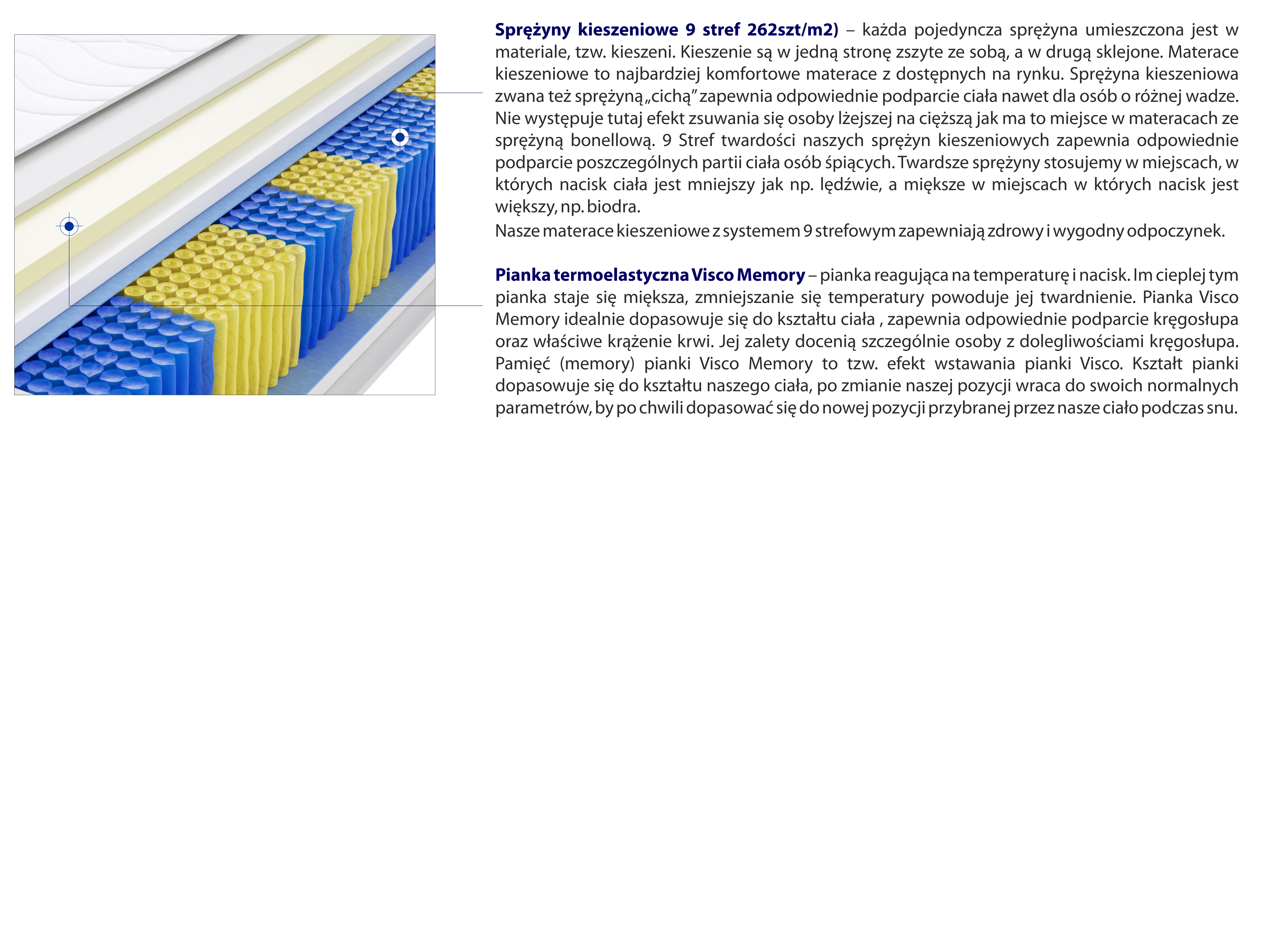 – każda pojedyncza sprężyna umieszczona jest w materiale, tzw. kieszeni. Kieszenie są w jedną stronę zszyte ze sobą, a w drugą sklejone. W przypadku sprężyn kieszeniowych Multipocket ilość sprężyn została zwiększona do 510szt/m2 – zapewnia to prawie 2 razy więcej punktów podparcia, zwiększa jakość snu i żywotność, trwałość materaca. Materace kieszeniowe to najbardziej komfortowe materace z dostępnych na rynku. Sprężyna kieszeniowa zwana też sprężyną „cichą” zapewnia odpowiednie podparcie ciała nawet dla osób o różnej wadze. Nie występuje tutaj efekt zsuwania się osoby lżejszej na cięższą jak ma to miejsce w materacach ze sprężyną bonellową. 9 Stref twardości naszych sprężyn kieszeniowych zapewnia odpowiednie podparcie poszczególnych partii ciała osób śpiących. Twardsze sprężyny stosujemy w miejscach, w których nacisk ciała jest mniejszy jak np. lędźwie, a miększe w miejscach w których nacisk jest większy, np. biodra.
