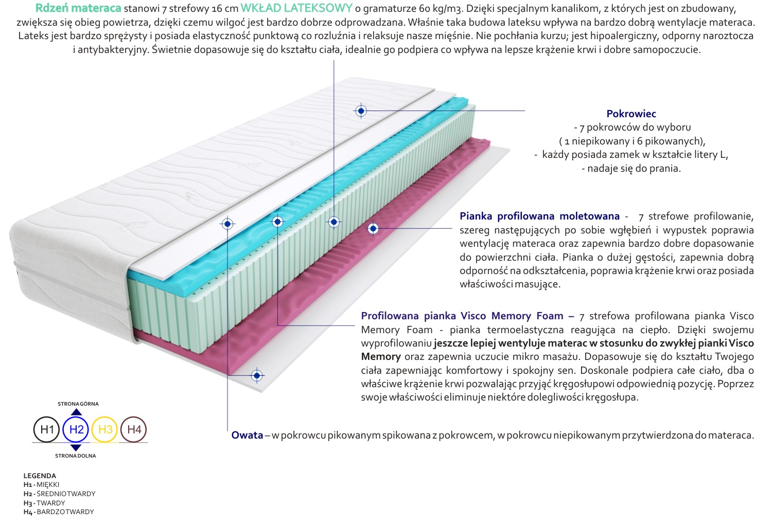 Pianka profilowana molet, Pianka profilowana Visco Memory, Pokrowiec, Rdzeń lateksowy 16 cm, Włókno klimatyzujące