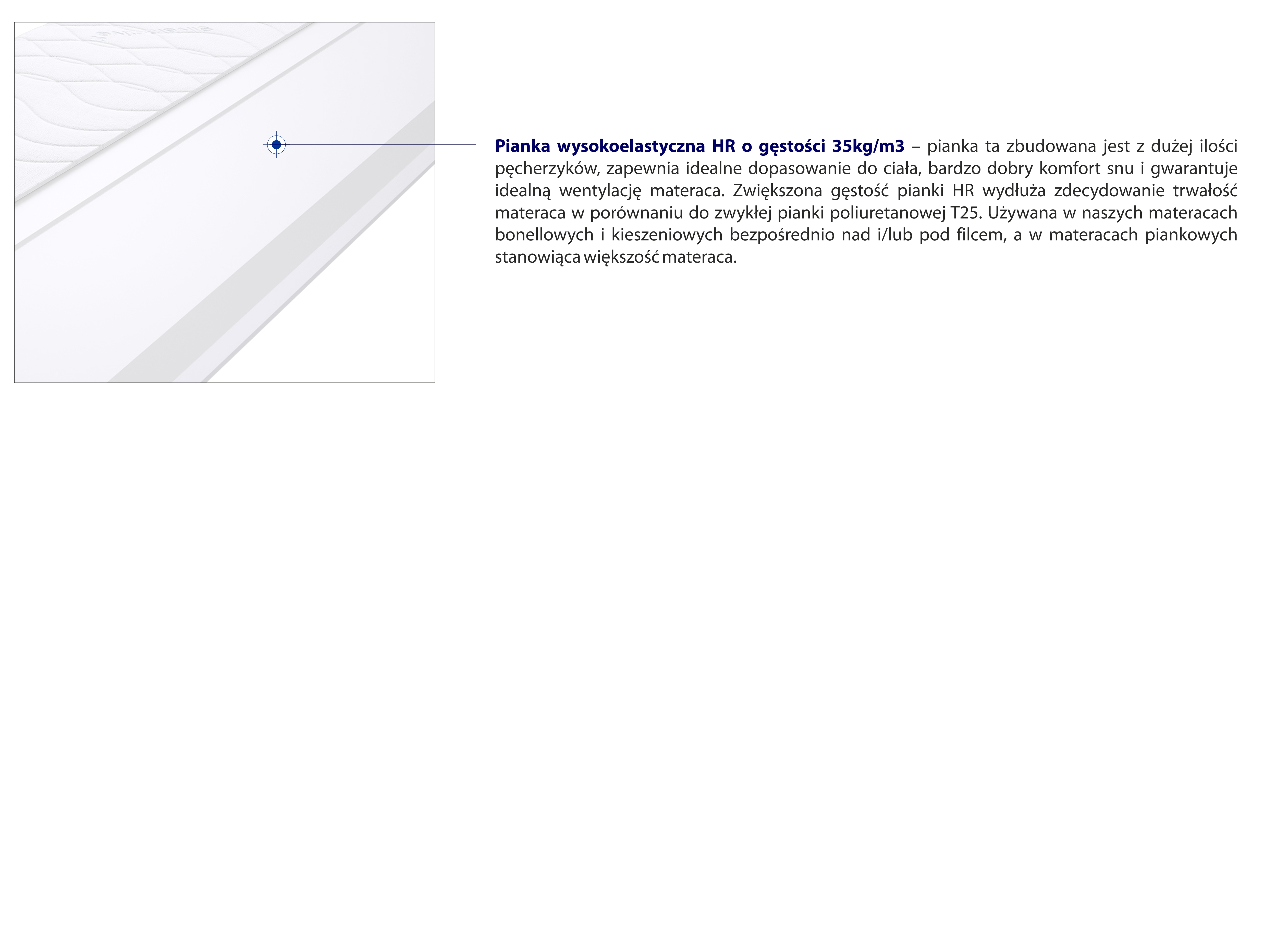o gęstości 35kg/m3 – pianka ta zbudowana jest z dużej ilości pęcherzyków, zapewnia idealne dopasowanie do ciała, bardzo dobry komfort snu i gwarantuje idealną wentylację materaca. Zwiększona gęstość pianki HR wydłuża zdecydowanie trwałość materaca w porównaniu do zwykłej pianki poliuretanowej T25. Używana w naszych materacach bonellowych i kieszeniowych bezpośrednio nad i/lub pod filcem, a w materacach piankowych stanowiąca większość materaca.