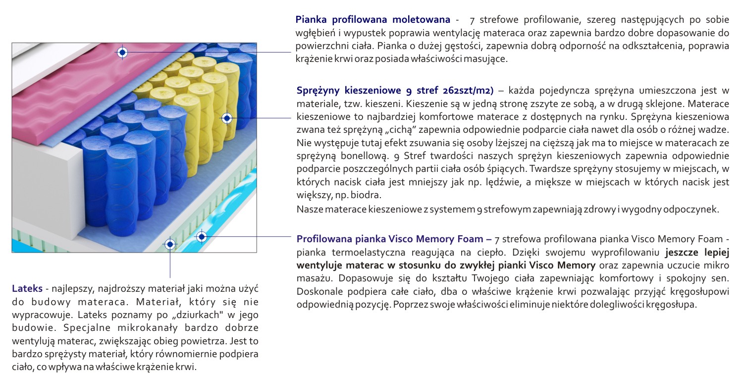 – każda pojedyncza sprężyna umieszczona jest w materiale, tzw. kieszeni. Kieszenie są w jedną stronę zszyte ze sobą, a w drugą sklejone. Materace kieszeniowe to najbardziej komfortowe materace z dostępnych na rynku. Sprężyna kieszeniowa zwana też sprężyną „cichą” zapewnia odpowiednie podparcie ciała nawet dla osób o różnej wadze. Nie występuje tutaj efekt zsuwania się osoby lżejszej na cięższą jak ma to miejsce w materacach ze sprężyną bonellową. 9 Stref twardości naszych sprężyn kieszeniowych zapewnia odpowiednie podparcie poszczególnych partii ciała osób śpiących. Twardsze sprężyny stosujemy w miejscach, w których nacisk ciała jest mniejszy jak np. lędźwie, a miększe w miejscach w których nacisk jest większy, np. biodra.