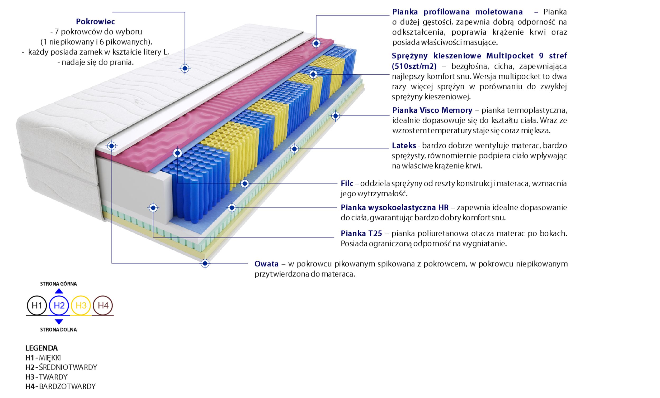 Filc, Lateks, Pianka profilowana molet, Pianka T25, Pianka Visco Memory, Pianka wysokoelastyczna HR, Pokrowiec, Sprężyny kieszeniowe Multipocket, Włókno klimatyzujące