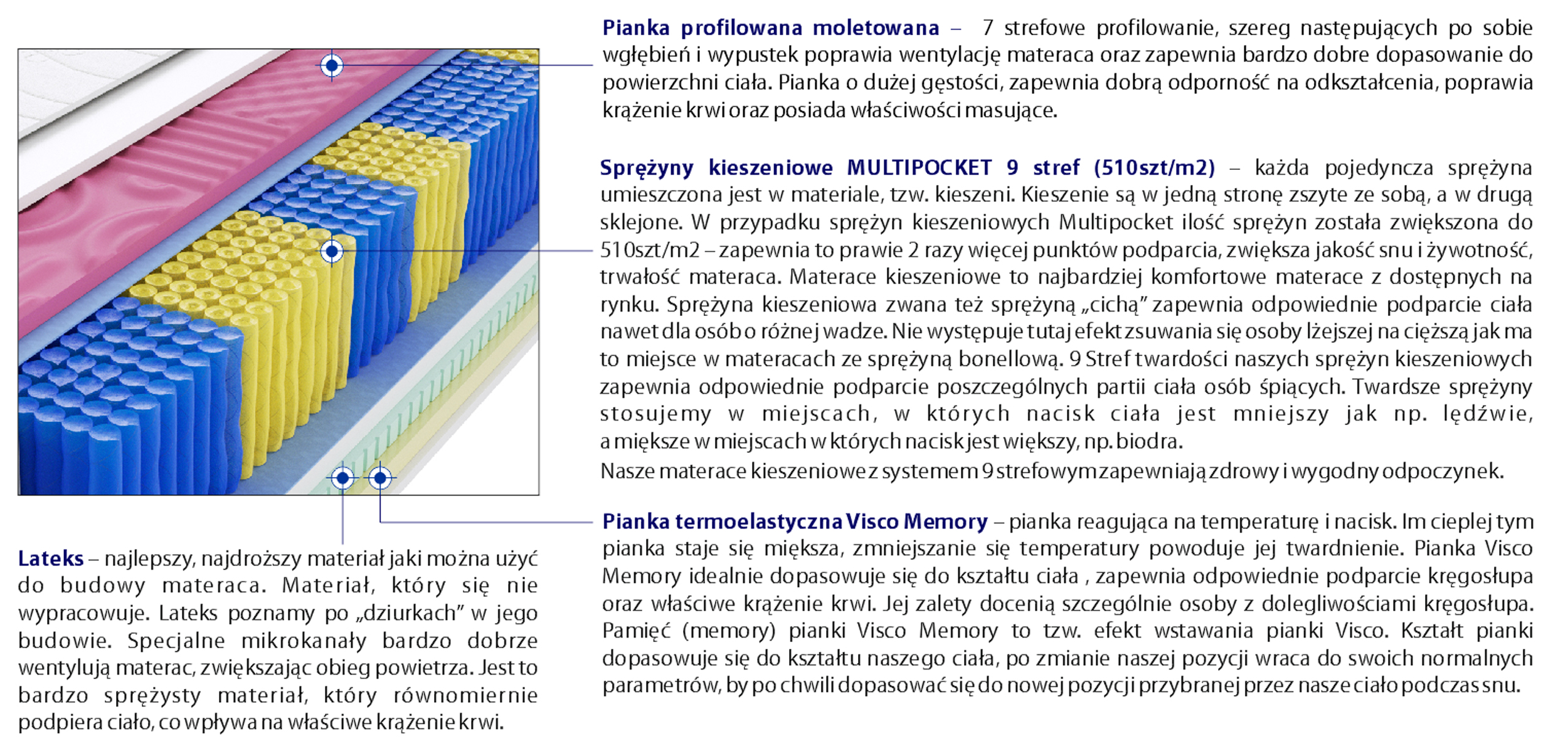 – każda pojedyncza sprężyna umieszczona jest w materiale, tzw. kieszeni. Kieszenie są w jedną stronę zszyte ze sobą, a w drugą sklejone. W przypadku sprężyn kieszeniowych Multipocket ilość sprężyn została zwiększona do 510szt/m2 – zapewnia to prawie 2 razy więcej punktów podparcia, zwiększa jakość snu i żywotność, trwałość materaca. Materace kieszeniowe to najbardziej komfortowe materace z dostępnych na rynku. Sprężyna kieszeniowa zwana też sprężyną „cichą” zapewnia odpowiednie podparcie ciała nawet dla osób o różnej wadze. Nie występuje tutaj efekt zsuwania się osoby lżejszej na cięższą jak ma to miejsce w materacach ze sprężyną bonellową. 9 Stref twardości naszych sprężyn kieszeniowych zapewnia odpowiednie podparcie poszczególnych partii ciała osób śpiących. Twardsze sprężyny stosujemy w miejscach, w których nacisk ciała jest mniejszy jak np. lędźwie, a miększe w miejscach w których nacisk jest większy, np. biodra.