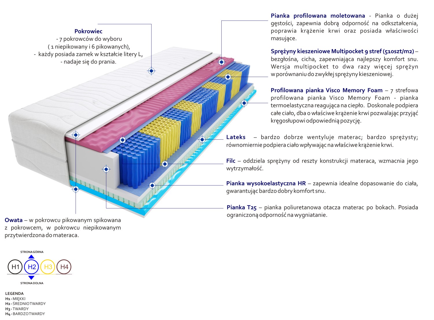 Filc, Lateks, Pianka profilowana molet, Pianka profilowana Visco Memory, Pianka T25, Pianka wysokoelastyczna HR, Pokrowiec, Sprężyny kieszeniowe Multipocket, Włókno klimatyzujące
