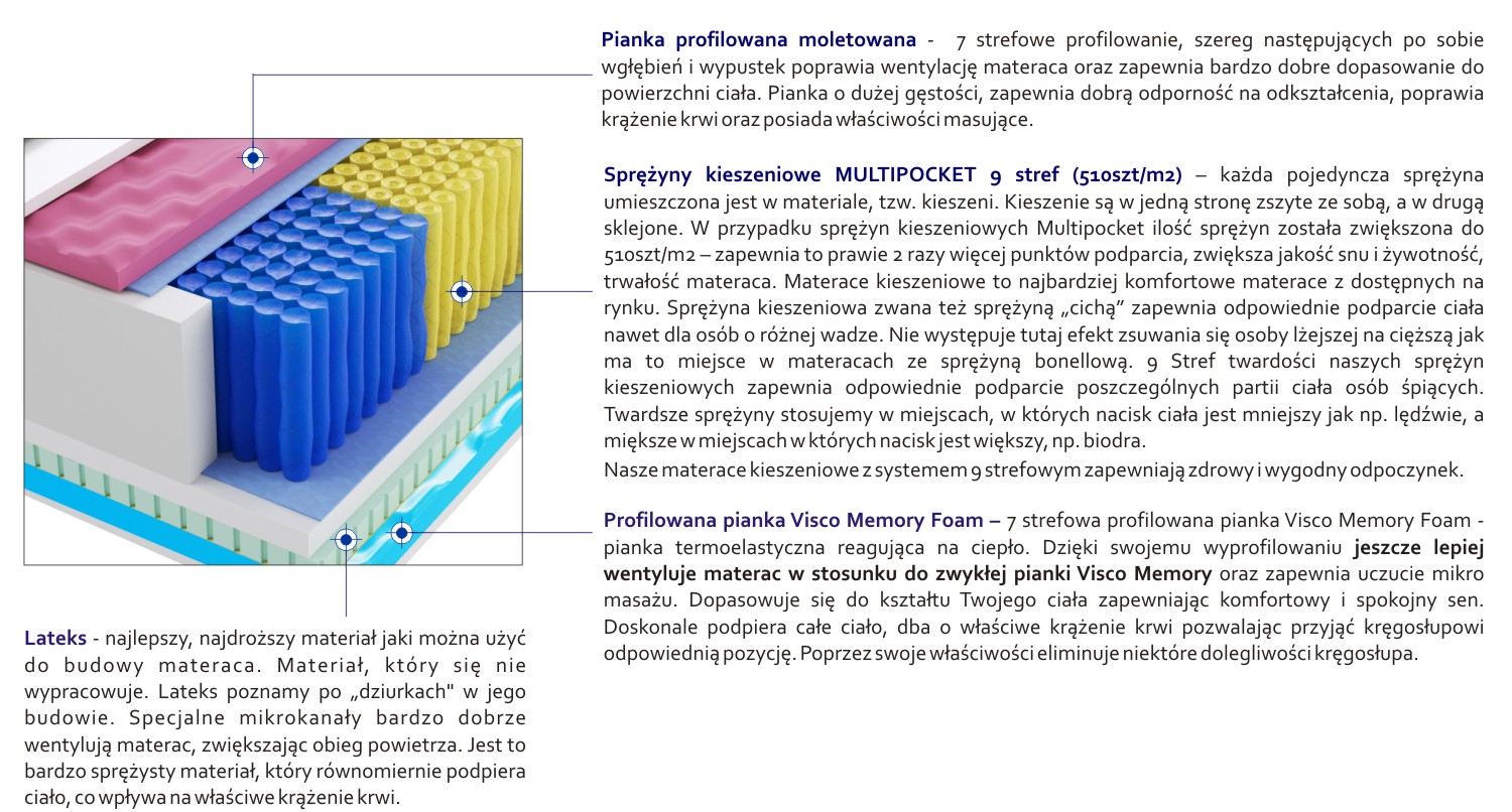 – każda pojedyncza sprężyna umieszczona jest w materiale, tzw. kieszeni. Kieszenie są w jedną stronę zszyte ze sobą, a w drugą sklejone. W przypadku sprężyn kieszeniowych Multipocket ilość sprężyn została zwiększona do 510szt/m2 – zapewnia to prawie 2 razy więcej punktów podparcia, zwiększa jakość snu i żywotność, trwałość materaca. Materace kieszeniowe to najbardziej komfortowe materace z dostępnych na rynku. Sprężyna kieszeniowa zwana też sprężyną „cichą” zapewnia odpowiednie podparcie ciała nawet dla osób o różnej wadze. Nie występuje tutaj efekt zsuwania się osoby lżejszej na cięższą jak ma to miejsce w materacach ze sprężyną bonellową. 9 Stref twardości naszych sprężyn kieszeniowych zapewnia odpowiednie podparcie poszczególnych partii ciała osób śpiących. Twardsze sprężyny stosujemy w miejscach, w których nacisk ciała jest mniejszy jak np. lędźwie, a miększe w miejscach w których nacisk jest większy, np. biodra. Nasze materace kieszeniowe z systemem 9 strefowym zapewniają zdrowy i wygodny odpoczynek.
