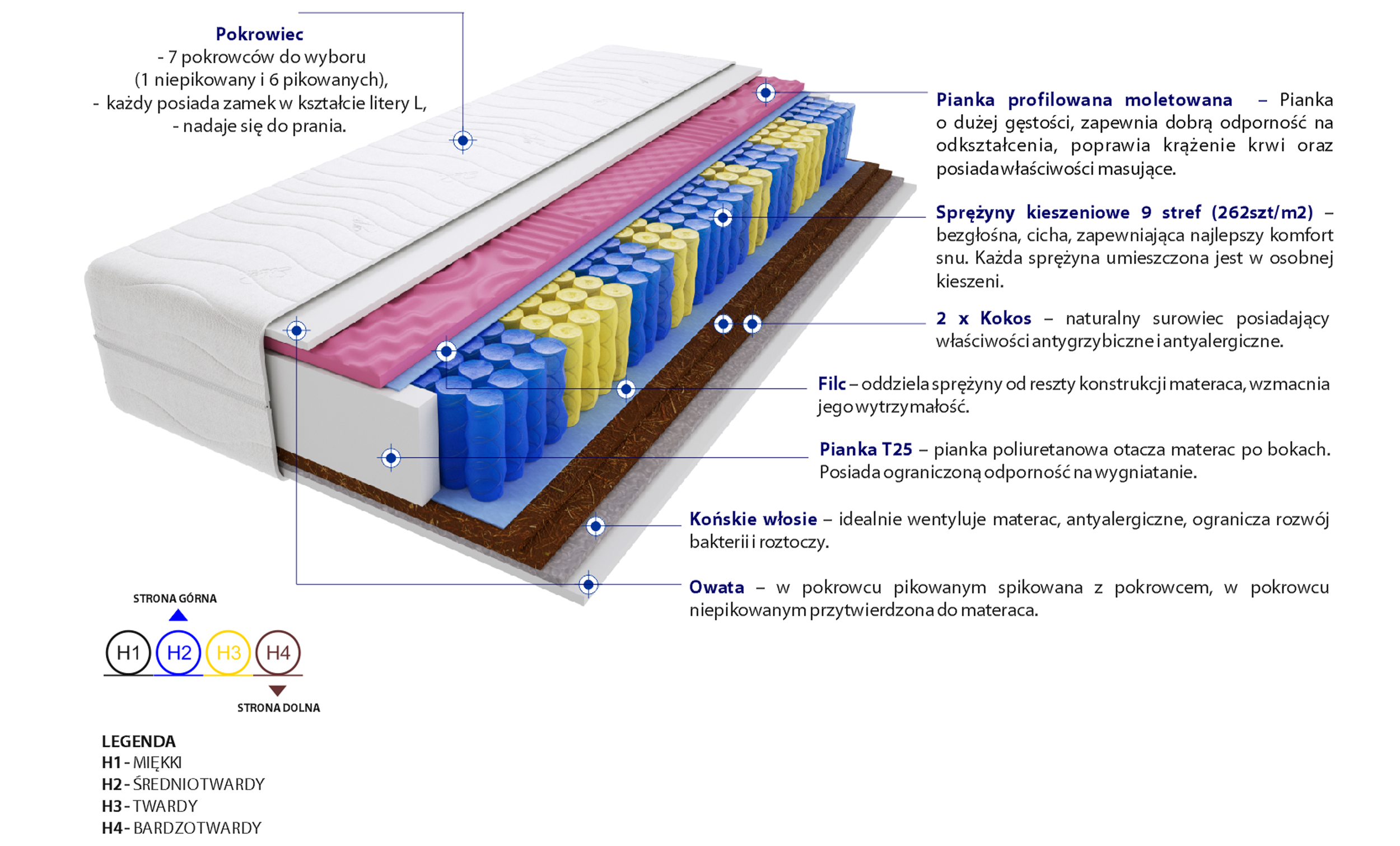 2x Kokos, Filc, Końskie Włosie, Pianka profilowana molet, Pianka T25, Pianka wysokoelastyczna HR, Pokrowiec, Sprężyny kieszeniowe, Włókno klimatyzujące