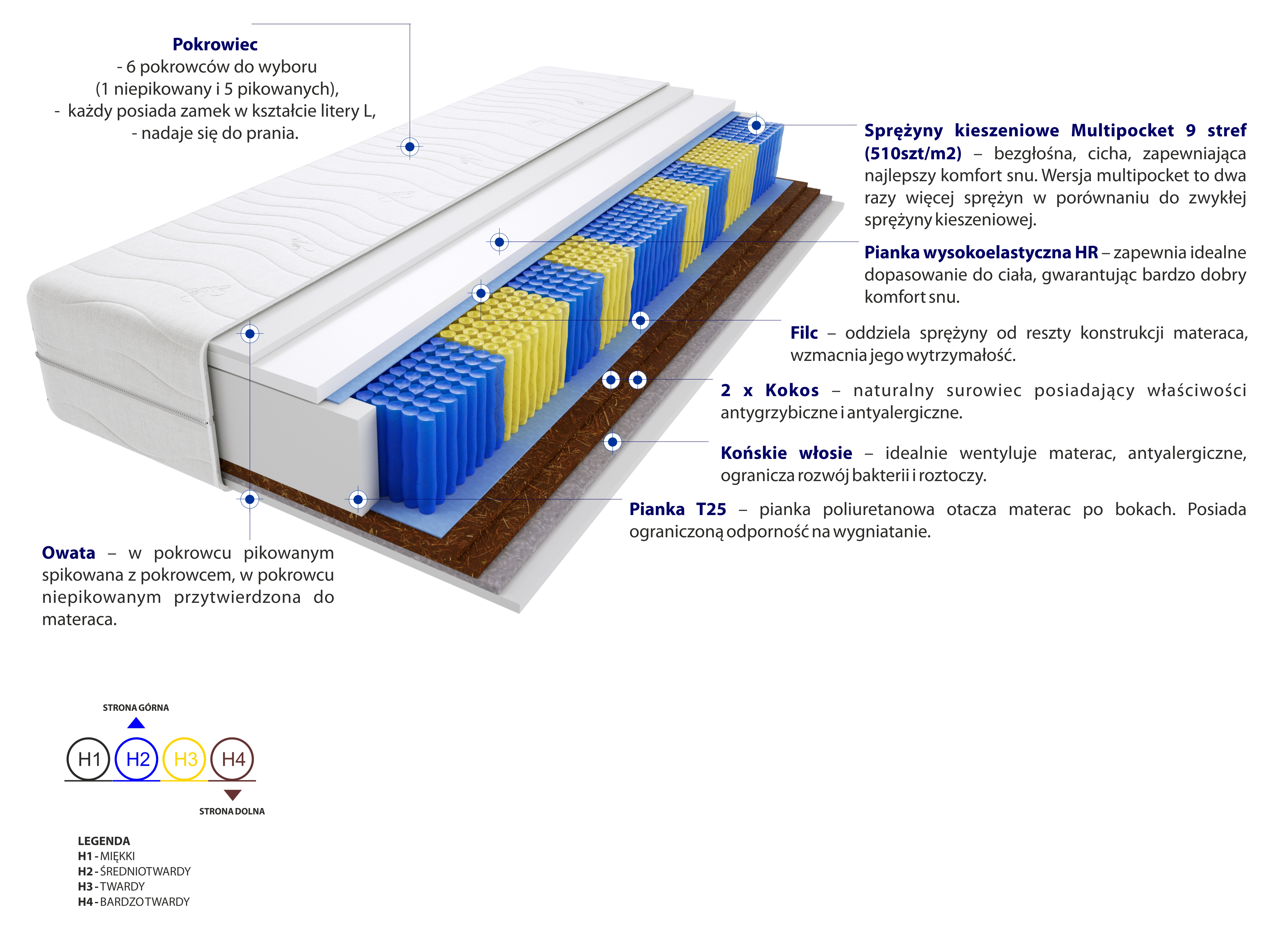 2x Kokos, Filc, Końskie Włosie, Pianka T25, Pianka wysokoelastyczna HR, Pokrowiec, Sprężyny kieszeniowe Multipocket, Włókno klimatyzujące