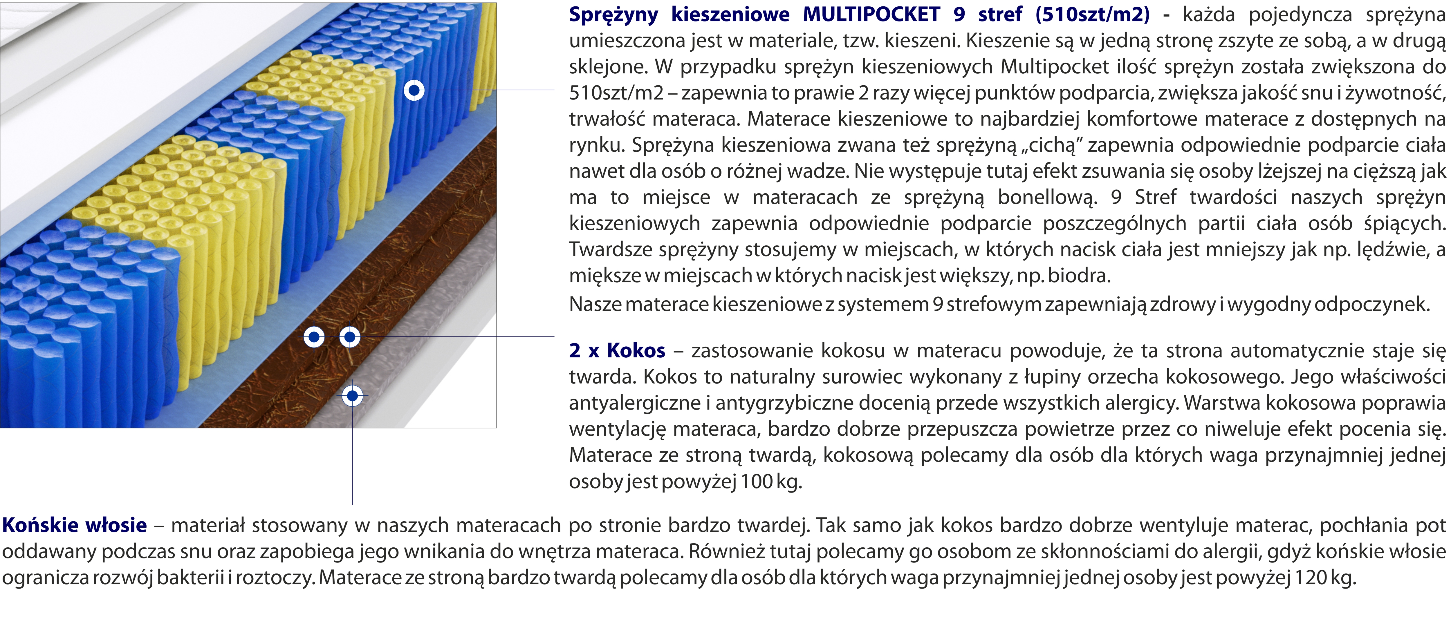 – każda pojedyncza sprężyna umieszczona jest w materiale, tzw. kieszeni. Kieszenie są w jedną stronę zszyte ze sobą, a w drugą sklejone. W przypadku sprężyn kieszeniowych Multipocket ilość sprężyn została zwiększona do 510szt/m2 – zapewnia to prawie 2 razy więcej punktów podparcia, zwiększa jakość snu i żywotność, trwałość materaca. Materace kieszeniowe to najbardziej komfortowe materace z dostępnych na rynku. Sprężyna kieszeniowa zwana też sprężyną „cichą” zapewnia odpowiednie podparcie ciała nawet dla osób o różnej wadze. Nie występuje tutaj efekt zsuwania się osoby lżejszej na cięższą jak ma to miejsce w materacach ze sprężyną bonellową. 9 Stref twardości naszych sprężyn kieszeniowych zapewnia odpowiednie podparcie poszczególnych partii ciała osób śpiących. Twardsze sprężyny stosujemy w miejscach, w których nacisk ciała jest mniejszy jak np. lędźwie, a miększe w miejscach w których nacisk jest większy, np. biodra.