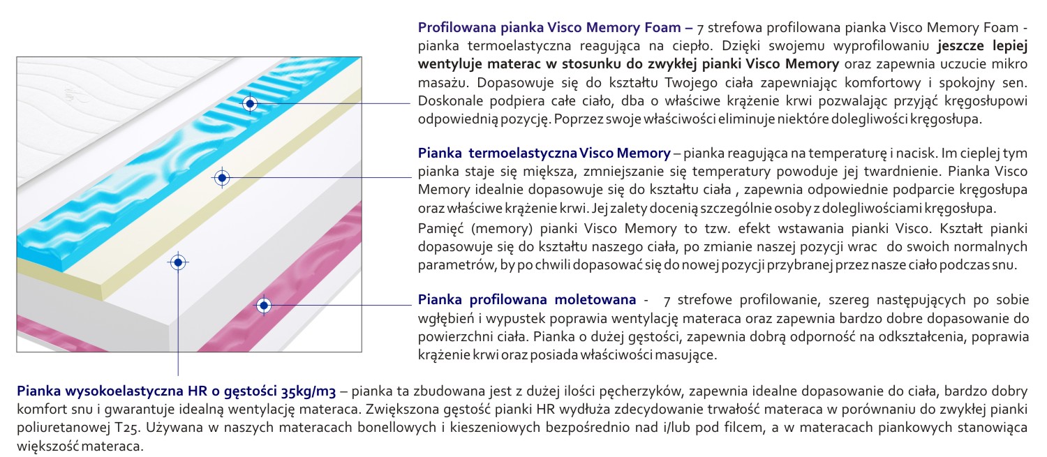 – inaczej zwana termopianką, teraz w wersji profilowanej – reagująca na temperaturę i nacisk. Im cieplej tym pianka staje się miększa, zmniejszanie się temperatury powoduje jej twardnienie. Pianka Visco Memory idealnie dopasowuje się do kształtu ciała , zapewnia odpowiednie podparcie kręgosłupa oraz właściwe krążenie krwi. W wersji profilowanej posiada właściwości mikromasujące. Jej zalety docenią szczególnie osoby z dolegliwościami kręgosłupa. Pamięć (memory) pianki Visco Memory to tzw. efekt wstawania pianki Visco. Kształt pianki dopasowuje się do kształtu naszego ciała, po zmianie naszej pozycji wraca do swoich normalnych parametrów, by po chwili dopasować się do nowej pozycji przybranej przez nasze ciało podczas snu.