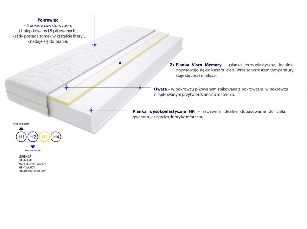 – pianka reagująca na temperaturę i nacisk. Im cieplej tym pianka staje się miększa, zmniejszanie się temperatury powoduje jej twardnienie. Pianka Visco Memory idealnie dopasowuje się do kształtu ciała , zapewnia odpowiednie podparcie kręgosłupa oraz właściwe krążenie krwi. Jej zalety docenią szczególnie osoby z dolegliwościami kręgosłupa. Pamięć (memory) pianki Visco Memory to tzw. efekt wstawania pianki Visco. Kształt pianki dopasowuje się do kształtu naszego ciała, po zmianie naszej pozycji wraca do swoich normalnych parametrów, by po chwili dopasować się do nowej pozycji przybranej przez nasze ciało podczas snu.