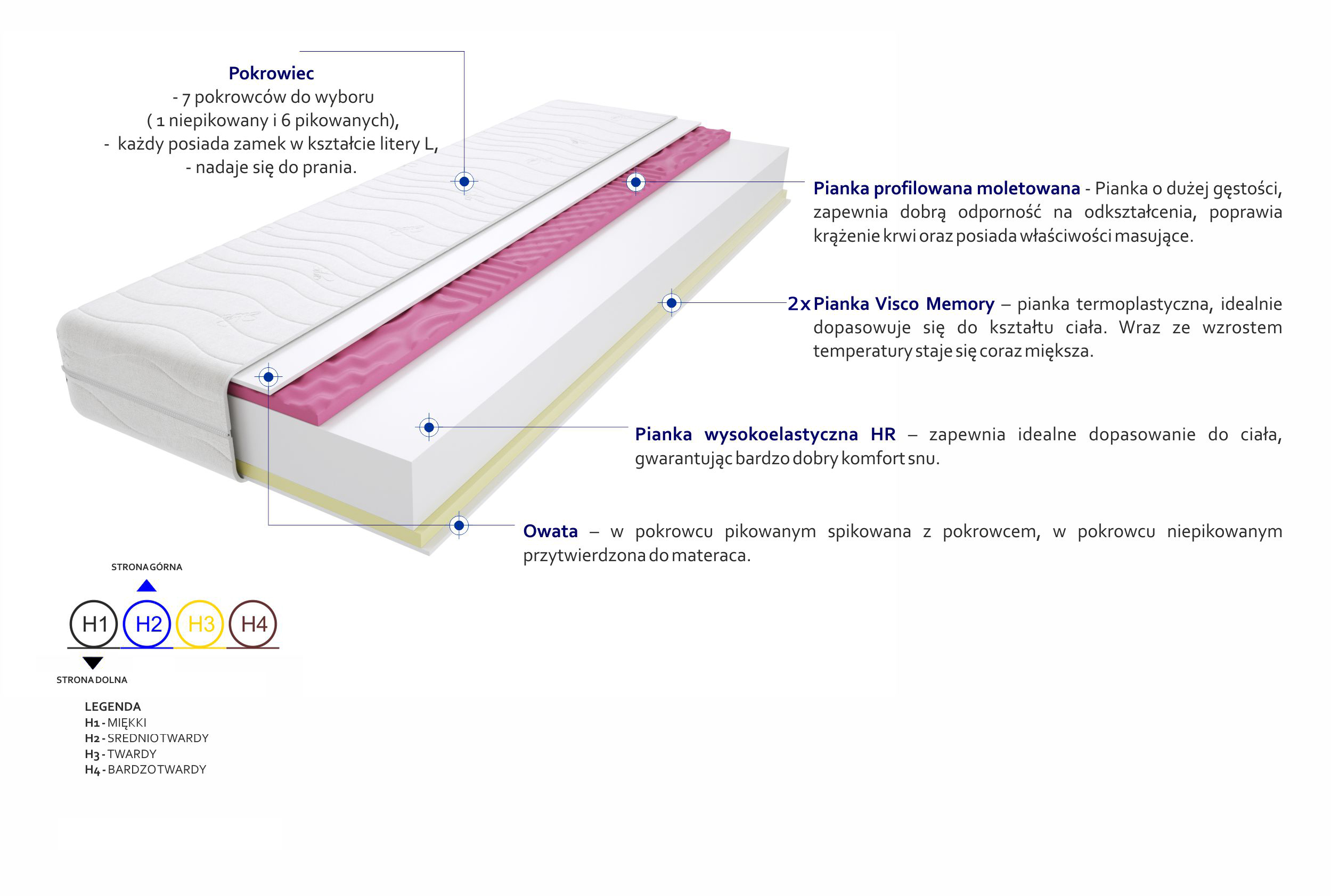2x Pianka Visco Memory, Pianka profilowana molet, Pianka wysokoelastyczna HR, Pokrowiec, Włókno klimatyzujące