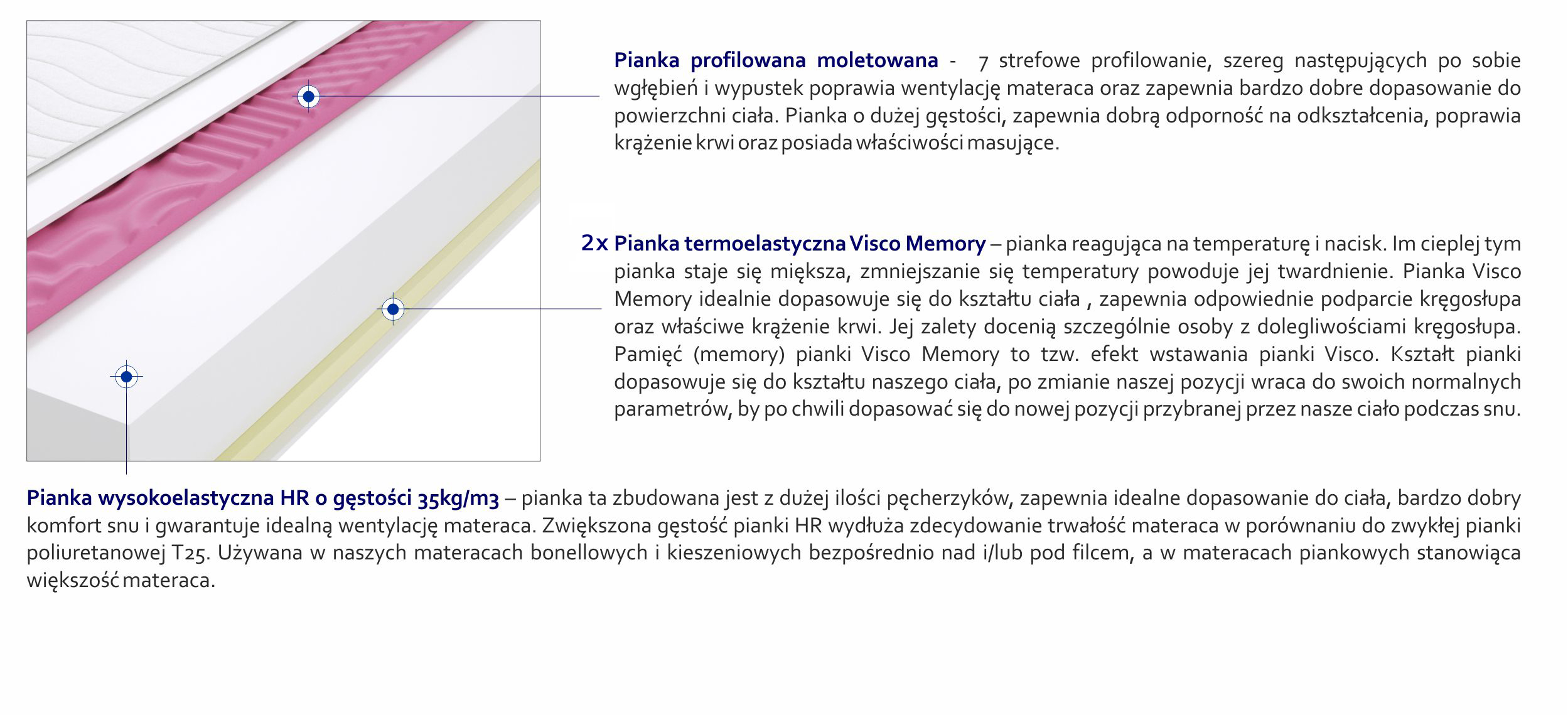 o gęstości 35kg/m3 – pianka ta zbudowana jest z dużej ilości pęcherzyków, zapewnia idealne dopasowanie do ciała, bardzo dobry komfort snu i gwarantuje idealną wentylację materaca. Zwiększona gęstość pianki HR wydłuża zdecydowanie trwałość materaca w porównaniu do zwykłej pianki poliuretanowej T25. Używana w naszych materacach bonellowych i kieszeniowych bezpośrednio nad i/lub pod filcem, a w materacach piankowych stanowiąca większość materaca.