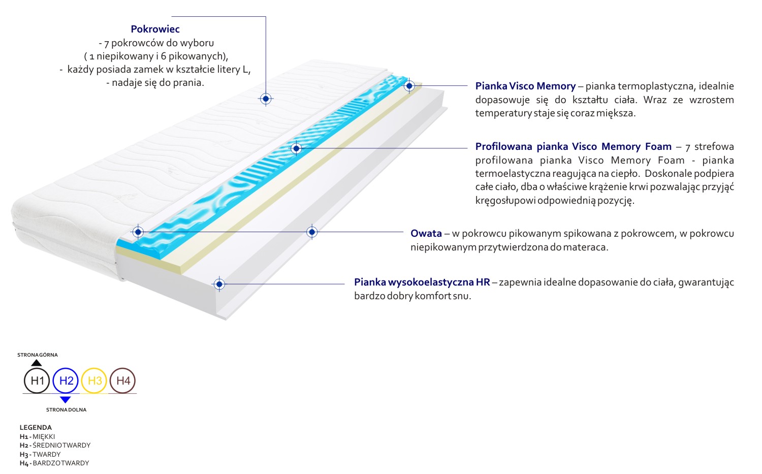 Filc, Pianka profilowana Visco Memory, Pianka Visco Memory, Pianka wysokoelastyczna HR, Pokrowiec, Włókno klimatyzujące