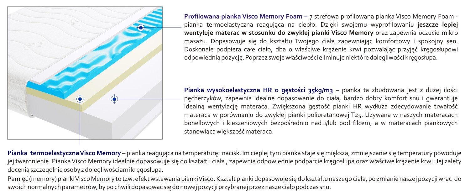 – inaczej zwana termopianką, teraz w wersji profilowanej – reagująca na temperaturę i nacisk. Im cieplej tym pianka staje się miększa, zmniejszanie się temperatury powoduje jej twardnienie. Pianka Visco Memory idealnie dopasowuje się do kształtu ciała , zapewnia odpowiednie podparcie kręgosłupa oraz właściwe krążenie krwi. W wersji profilowanej posiada właściwości mikromasujące. Jej zalety docenią szczególnie osoby z dolegliwościami kręgosłupa. Pamięć (memory) pianki Visco Memory to tzw. efekt wstawania pianki Visco. Kształt pianki dopasowuje się do kształtu naszego ciała, po zmianie naszej pozycji wraca do swoich normalnych parametrów, by po chwili dopasować się do nowej pozycji przybranej przez nasze ciało podczas snu.