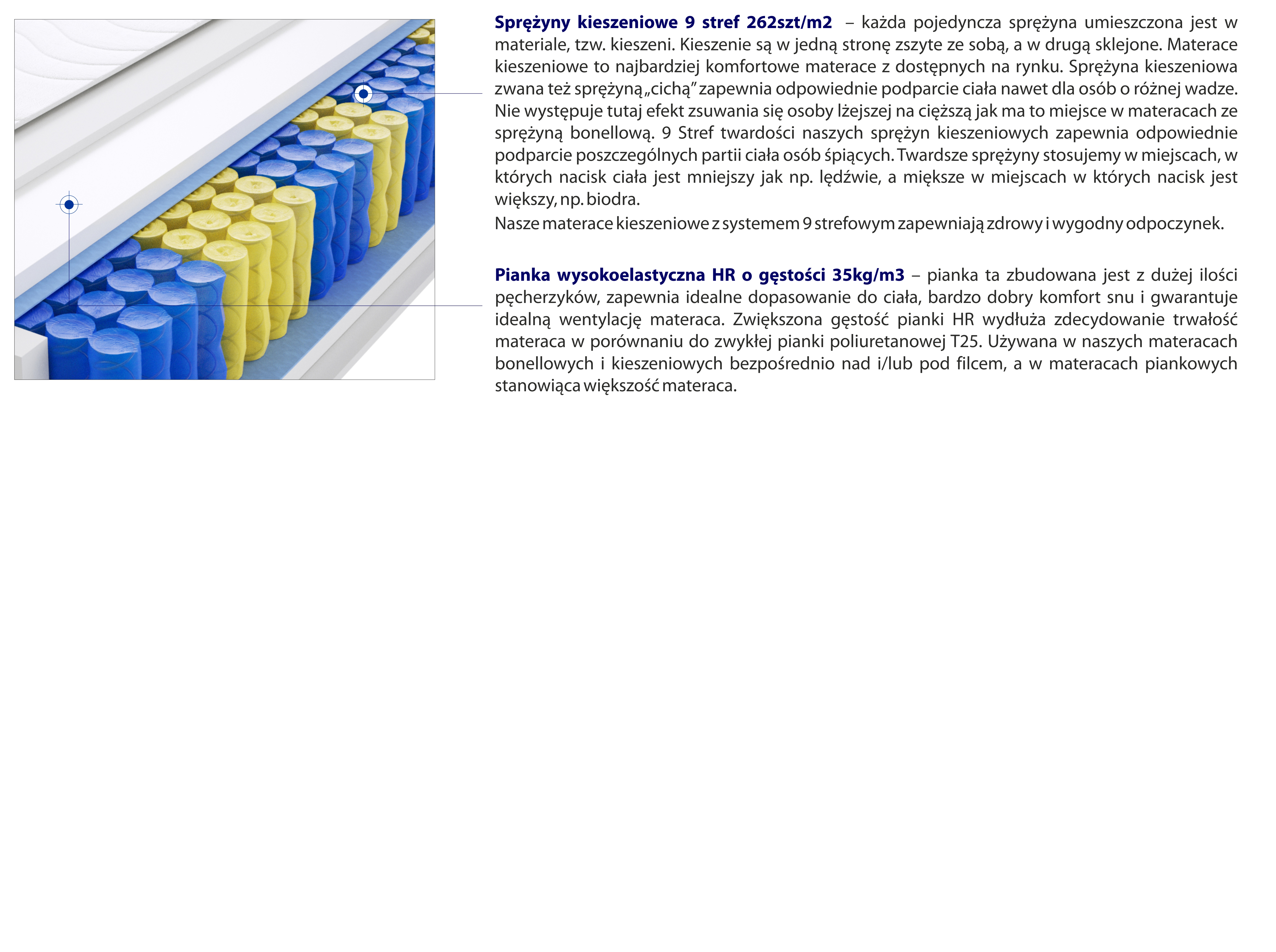 – każda pojedyncza sprężyna umieszczona jest w materiale, tzw. kieszeni. Kieszenie są w jedną stronę zszyte ze sobą, a w drugą sklejone. Materace kieszeniowe to najbardziej komfortowe materace z dostępnych na rynku. Sprężyna kieszeniowa zwana też sprężyną „cichą” zapewnia odpowiednie podparcie ciała nawet dla osób o różnej wadze. Nie występuje tutaj efekt zsuwania się osoby lżejszej na cięższą jak ma to miejsce w materacach ze sprężyną bonellową. 9 Stref twardości naszych sprężyn kieszeniowych zapewnia odpowiednie podparcie poszczególnych partii ciała osób śpiących. Twardsze sprężyny stosujemy w miejscach, w których nacisk ciała jest mniejszy jak np. lędźwie, a miększe w miejscach w których nacisk jest większy, np. biodra.