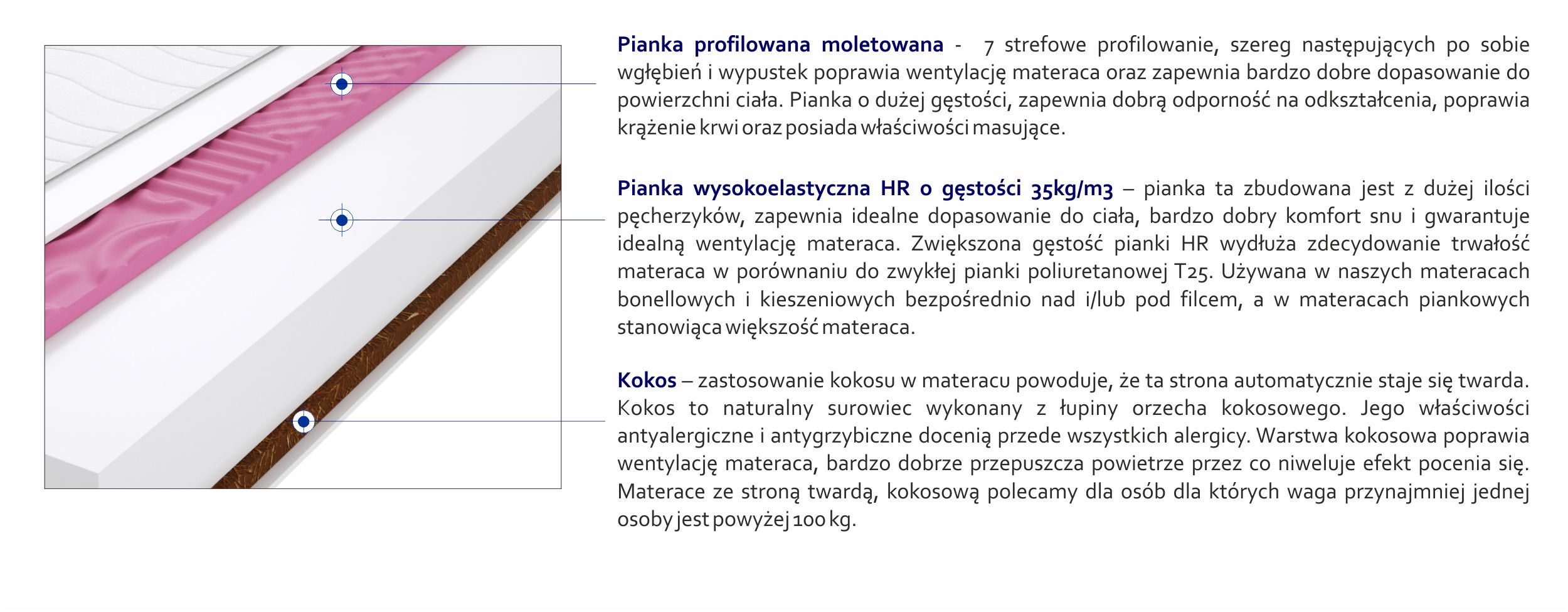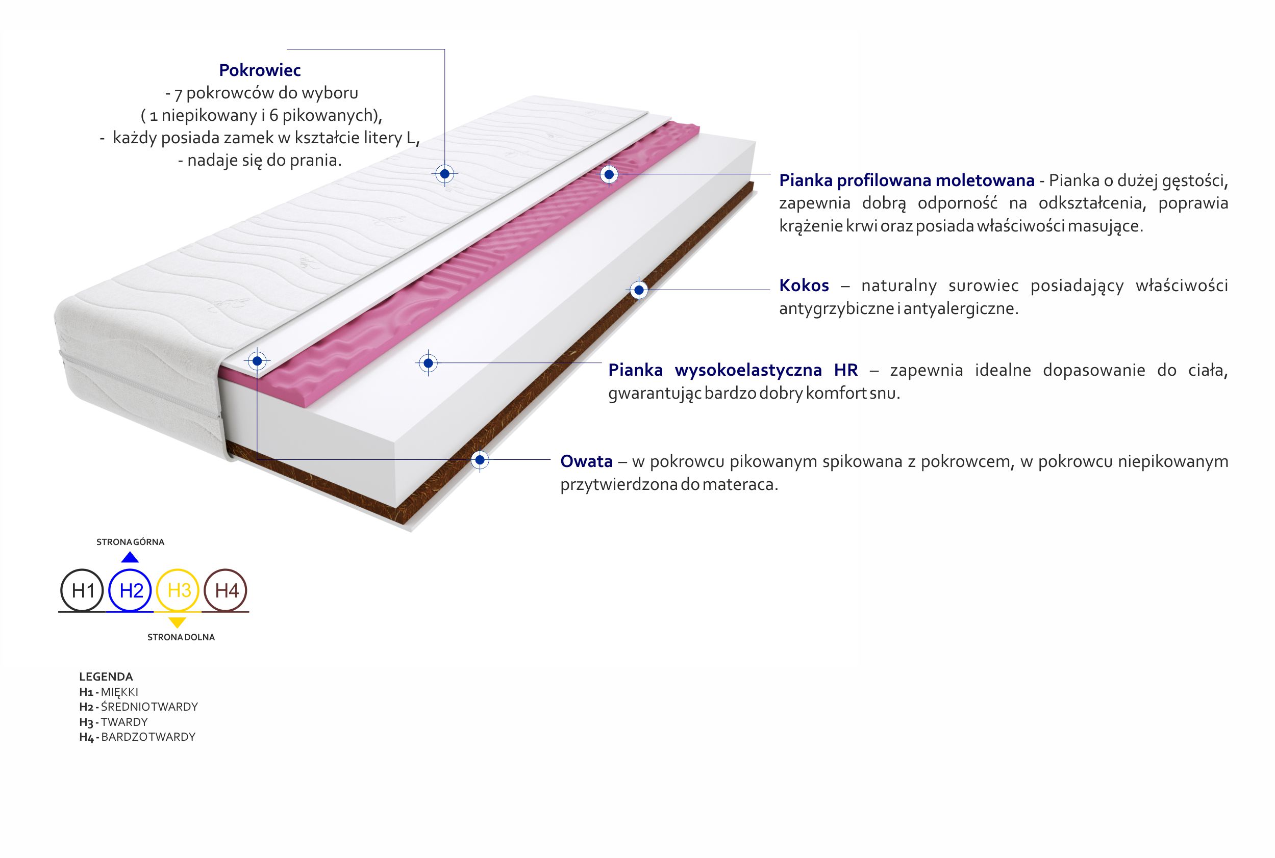 Kokos, Pianka profilowana molet, Pianka wysokoelastyczna HR, Pokrowiec, Włókno klimatyzujące