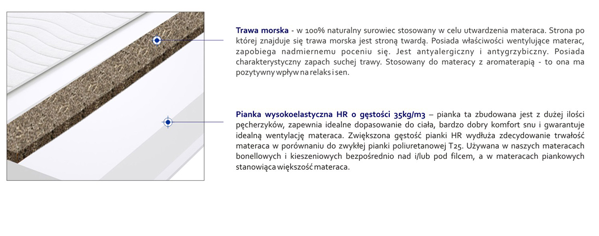 – szczególnie polecana jest osobom ze skłonnościami do alergii. Charakterystyczny zapach trawy morskiej ma zdrowotny wpływ na oczyszczanie dróg oddechowych, ze względu na zawartość jodu. Trawa morska używana jest w materacach po stronie twardej w celu utwardzenia powierzchni. Surowiec ten zapobiega poceniu się. Materace ze stroną twardą będą odpowiednie dla osób, których waga – przynajmniej jednej osoby przekracza 100kg.