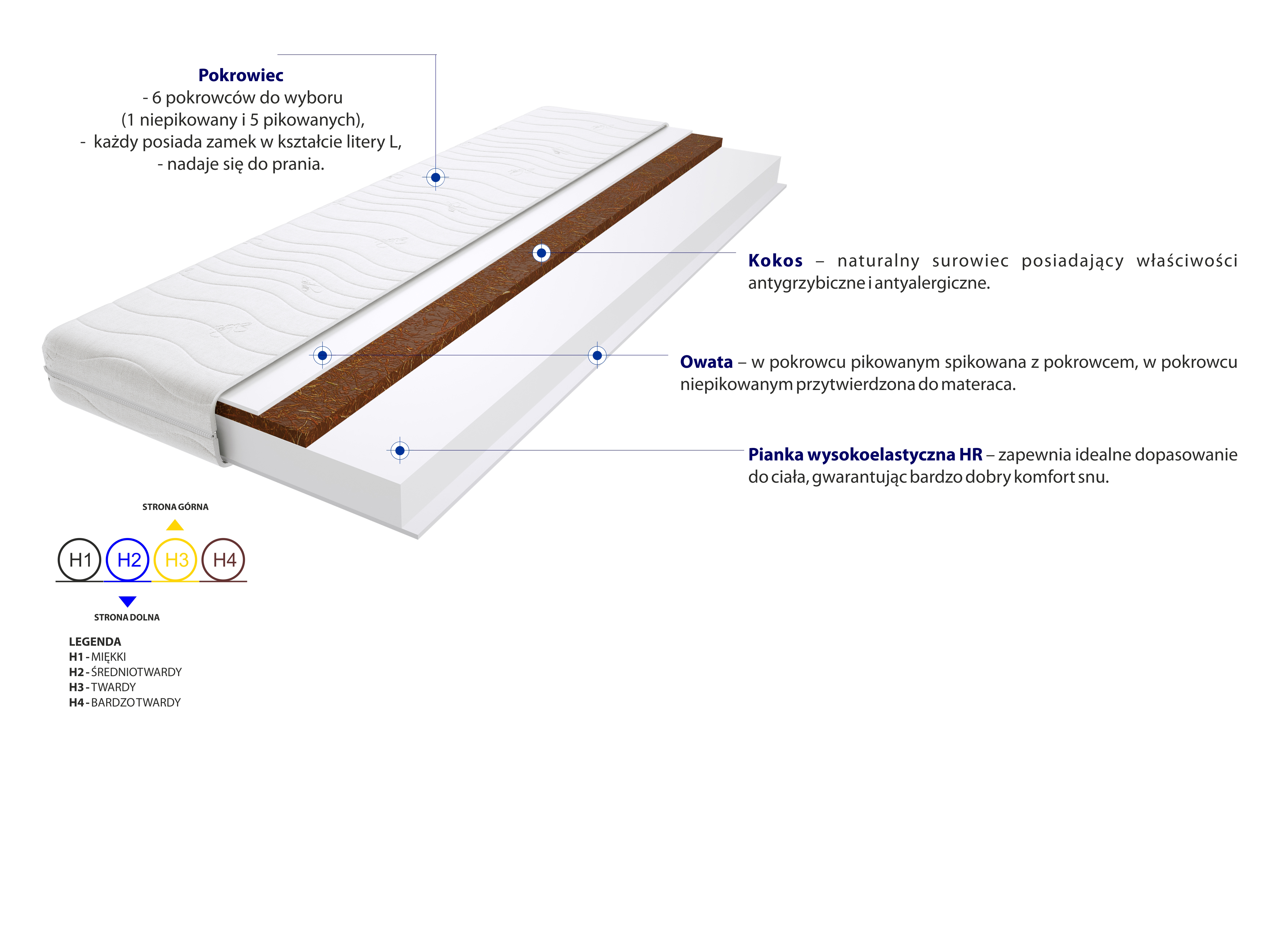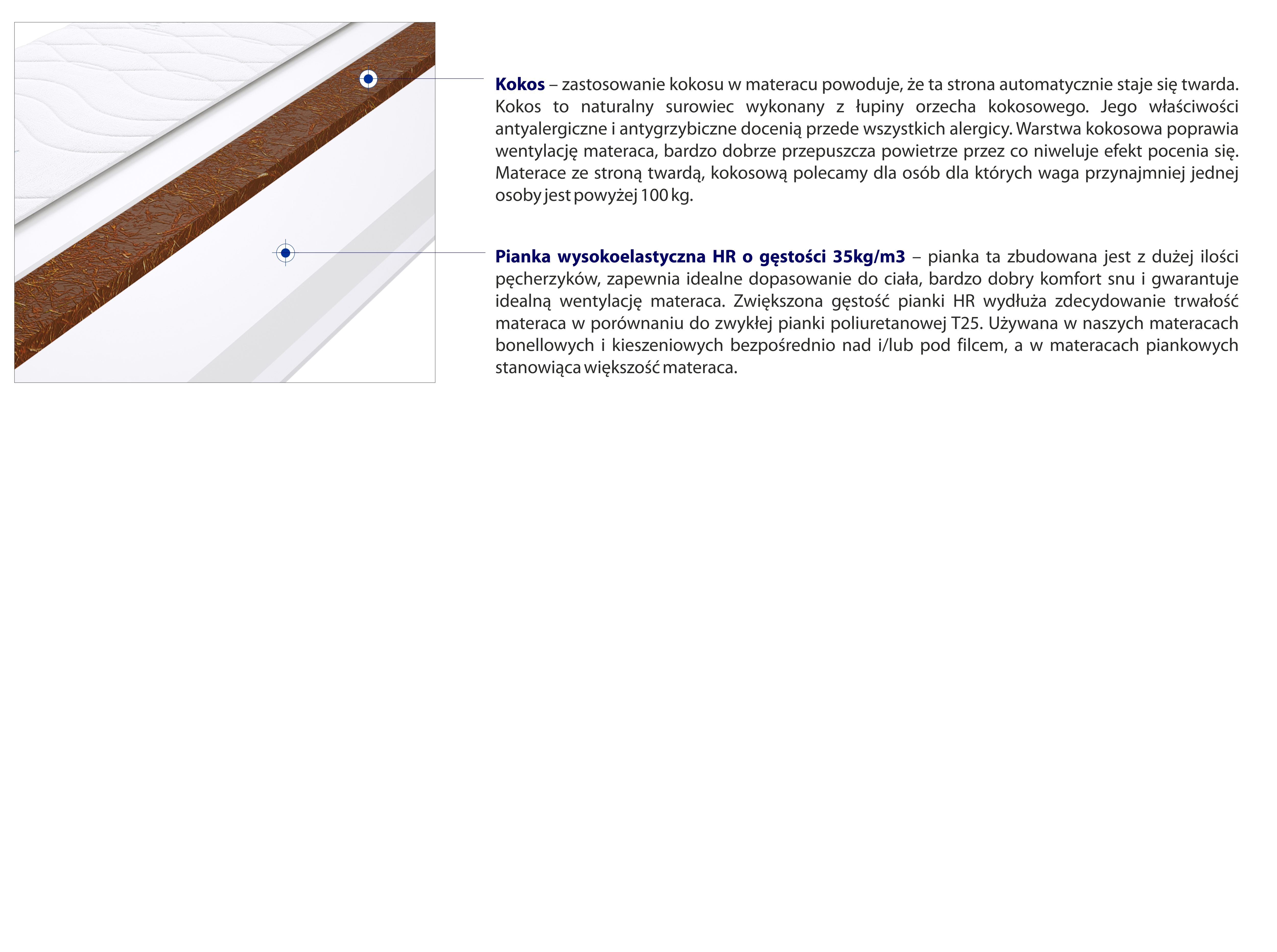 Kokos, Pianka wysokoelastyczna HR, Pokrowiec, Włókno klimatyzujące