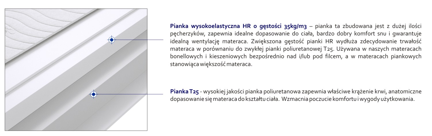 Pianka T25 – pianka poliuretanowa otacza materac po bokach. Posiada ograniczoną odporność na wygniatanie