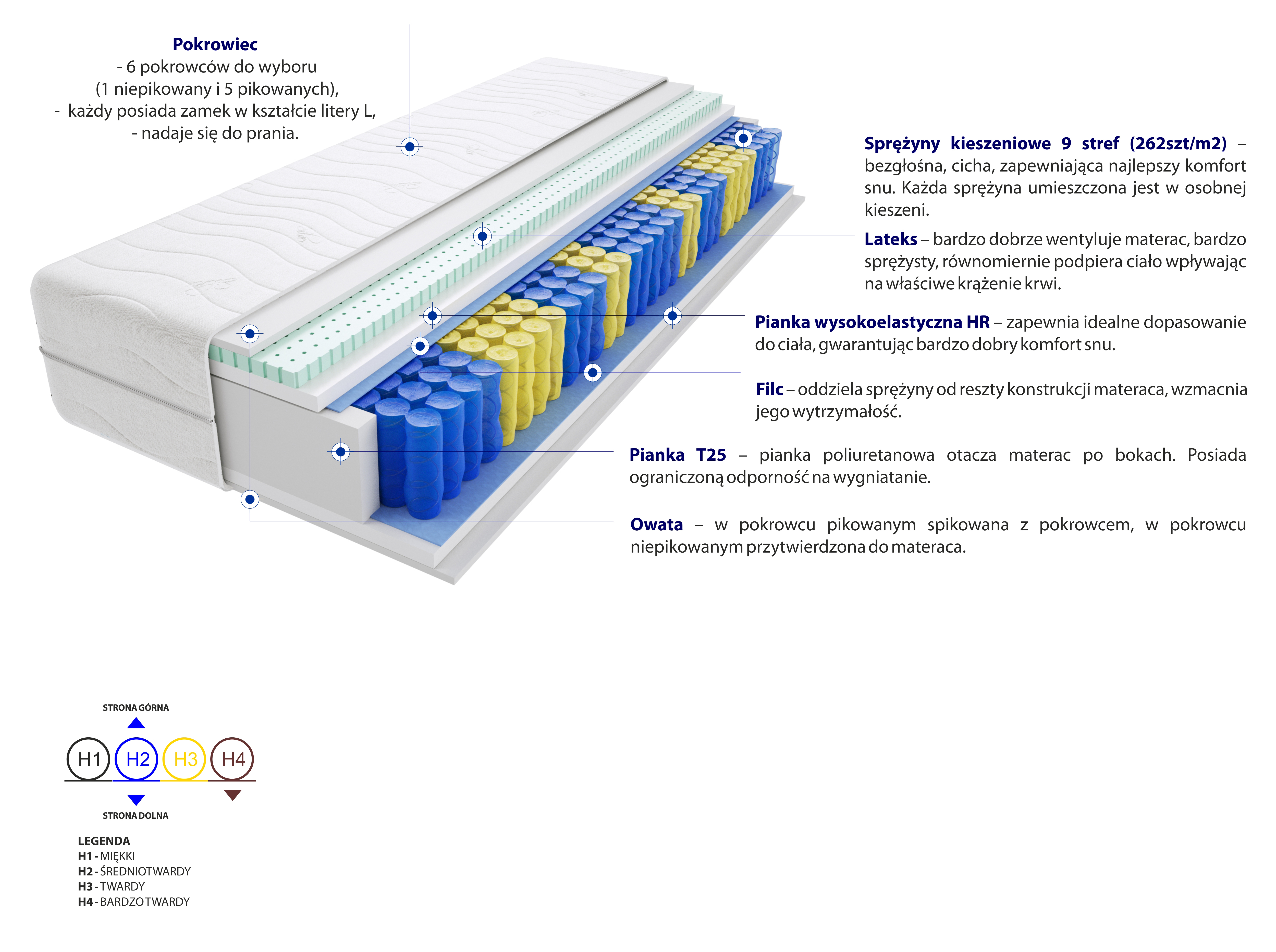 Filc, Lateks, Pianka T25, Pianka wysokoelastyczna HR, Pokrowiec, Sprężyny kieszeniowe, Włókno klimatyzujące