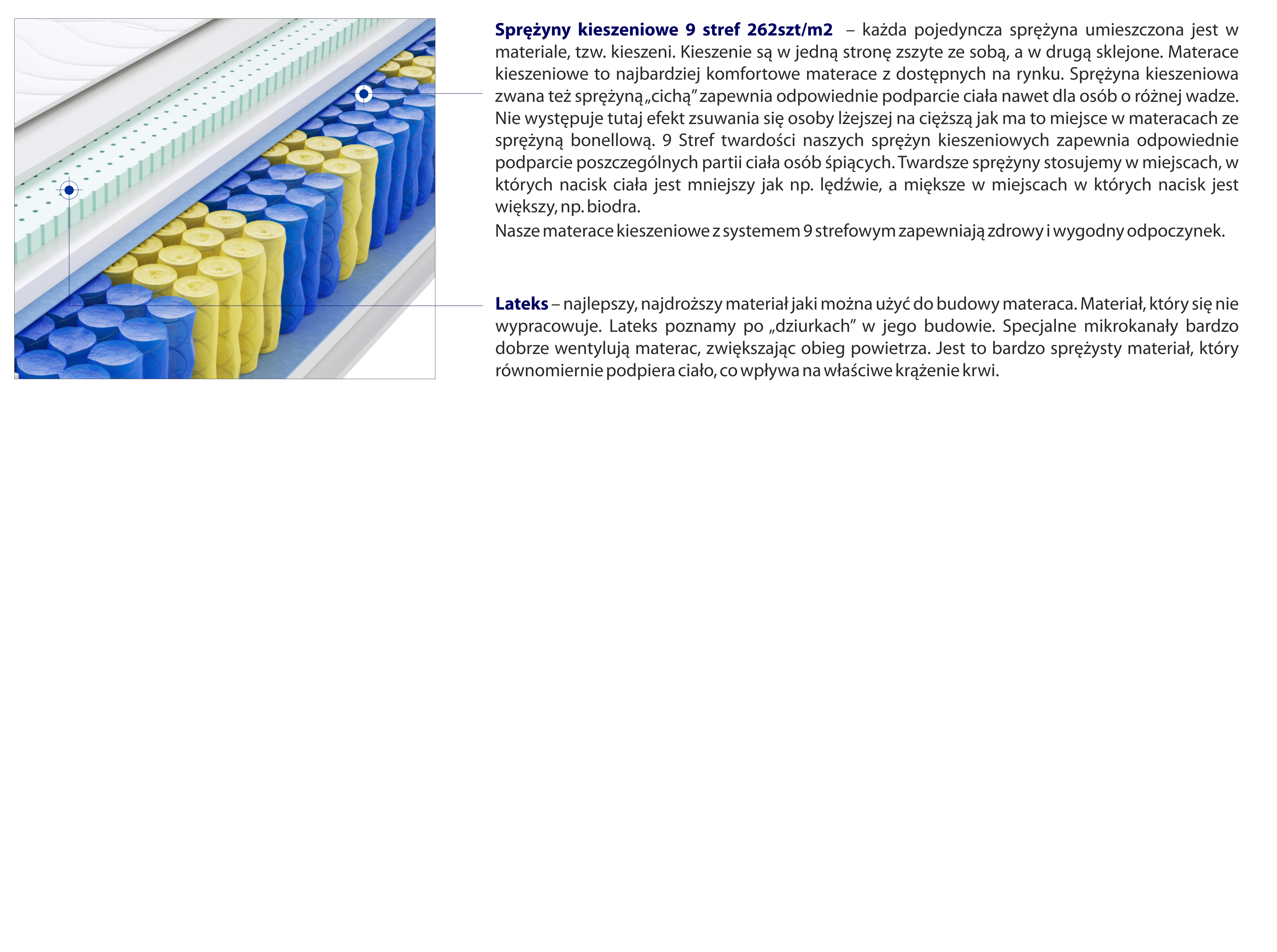 – każda pojedyncza sprężyna umieszczona jest w materiale, tzw. kieszeni. Kieszenie są w jedną stronę zszyte ze sobą, a w drugą sklejone. Materace kieszeniowe to najbardziej komfortowe materace z dostępnych na rynku. Sprężyna kieszeniowa zwana też sprężyną „cichą” zapewnia odpowiednie podparcie ciała nawet dla osób o różnej wadze. Nie występuje tutaj efekt zsuwania się osoby lżejszej na cięższą jak ma to miejsce w materacach ze sprężyną bonellową. 9 Stref twardości naszych sprężyn kieszeniowych zapewnia odpowiednie podparcie poszczególnych partii ciała osób śpiących. Twardsze sprężyny stosujemy w miejscach, w których nacisk ciała jest mniejszy jak np. lędźwie, a miększe w miejscach w których nacisk jest większy, np. biodra.