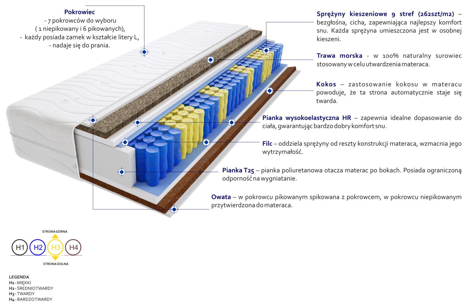 Filc, Kokos, Pianka T25, Pianka wysokoelastyczna HR, Pokrowiec, Sprężyny kieszeniowe, Trawa morska, Włókno klimatyzujące