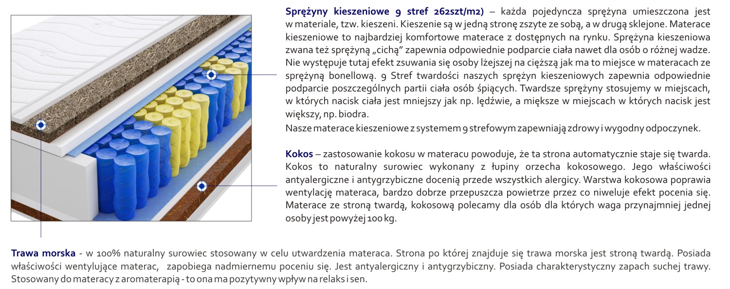 – każda pojedyncza sprężyna umieszczona jest w materiale, tzw. kieszeni. Kieszenie są w jedną stronę zszyte ze sobą, a w drugą sklejone. Materace kieszeniowe to najbardziej komfortowe materace z dostępnych na rynku. Sprężyna kieszeniowa zwana też sprężyną „cichą” zapewnia odpowiednie podparcie ciała nawet dla osób o różnej wadze. Nie występuje tutaj efekt zsuwania się osoby lżejszej na cięższą jak ma to miejsce w materacach ze sprężyną bonellową. 9 Stref twardości naszych sprężyn kieszeniowych zapewnia odpowiednie podparcie poszczególnych partii ciała osób śpiących. Twardsze sprężyny stosujemy w miejscach, w których nacisk ciała jest mniejszy jak np. lędźwie, a miększe w miejscach w których nacisk jest większy, np. biodra.