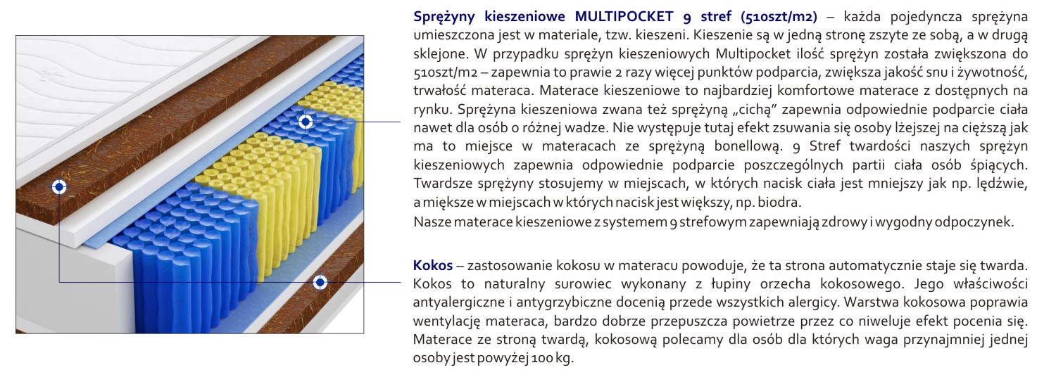 – każda pojedyncza sprężyna umieszczona jest w materiale, tzw. kieszeni. Kieszenie są w jedną stronę zszyte ze sobą, a w drugą sklejone. W przypadku sprężyn kieszeniowych Multipocket ilość sprężyn została zwiększona do 510szt/m2 – zapewnia to prawie 2 razy więcej punktów podparcia, zwiększa jakość snu i żywotność, trwałość materaca. Materace kieszeniowe to najbardziej komfortowe materace z dostępnych na rynku. Sprężyna kieszeniowa zwana też sprężyną „cichą” zapewnia odpowiednie podparcie ciała nawet dla osób o różnej wadze. Nie występuje tutaj efekt zsuwania się osoby lżejszej na cięższą jak ma to miejsce w materacach ze sprężyną bonellową. 9 Stref twardości naszych sprężyn kieszeniowych zapewnia odpowiednie podparcie poszczególnych partii ciała osób śpiących. Twardsze sprężyny stosujemy w miejscach, w których nacisk ciała jest mniejszy jak np. lędźwie, a miększe w miejscach w których nacisk jest większy, np. biodra.