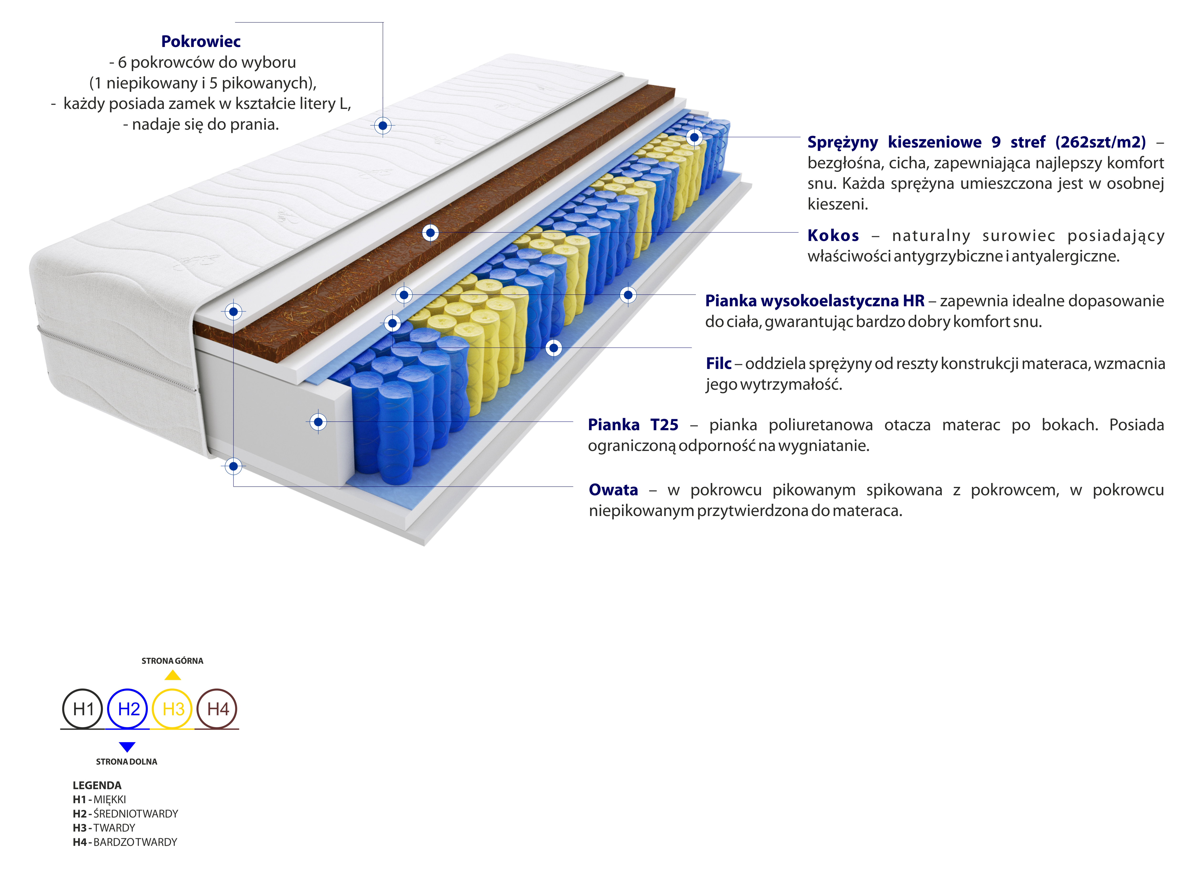 Filc, Kokos, Pianka T25, Pianka wysokoelastyczna HR, Pokrowiec, Sprężyny kieszeniowe, Włókno klimatyzujące