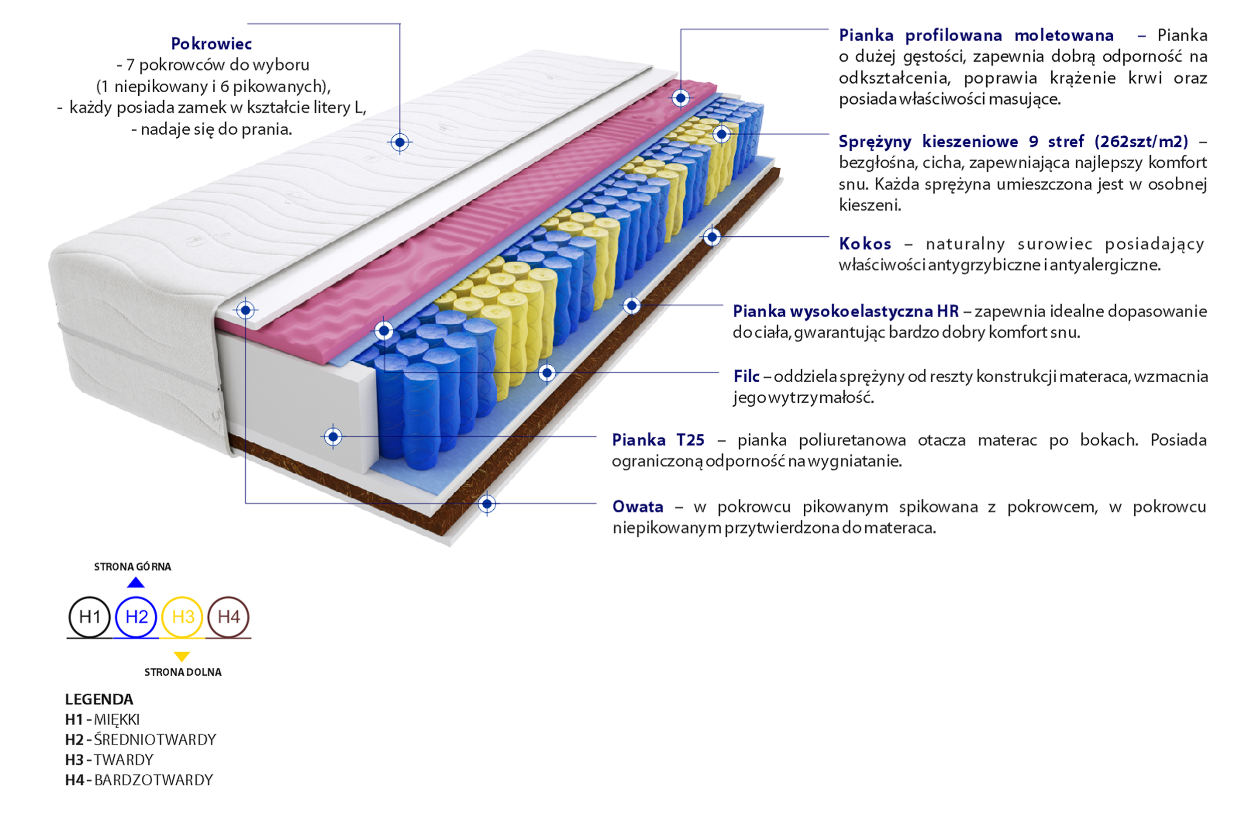 sprezyny-kieszeniowe, pianka-wysokoelastyczna-hr, pianka-profilowana-molet, kokos, pianka-t25, pokrowiec, filc, wlokno-klimatyzujace