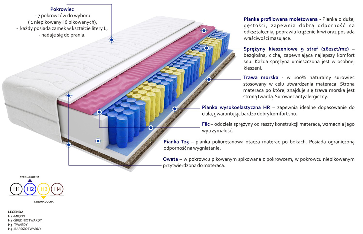 Filc, Pianka profilowana molet, Pianka T25, Pianka wysokoelastyczna HR, Pokrowiec, Sprężyny kieszeniowe, Trawa morska, Włókno klimatyzujące