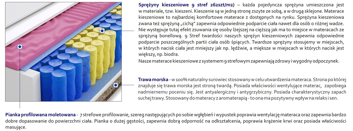 – każda pojedyncza sprężyna umieszczona jest w materiale, tzw. kieszeni. Kieszenie są w jedną stronę zszyte ze sobą, a w drugą sklejone. Materace kieszeniowe to najbardziej komfortowe materace z dostępnych na rynku. Sprężyna kieszeniowa zwana też sprężyną „cichą” zapewnia odpowiednie podparcie ciała nawet dla osób o różnej wadze. Nie występuje tutaj efekt zsuwania się osoby lżejszej na cięższą jak ma to miejsce w materacach ze sprężyną bonellową. 9 Stref twardości naszych sprężyn kieszeniowych zapewnia odpowiednie podparcie poszczególnych partii ciała osób śpiących. Twardsze sprężyny stosujemy w miejscach, w których nacisk ciała jest mniejszy jak np. lędźwie, a miększe w miejscach w których nacisk jest większy, np. biodra.