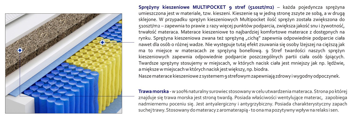 – każda pojedyncza sprężyna umieszczona jest w materiale, tzw. kieszeni. Kieszenie są w jedną stronę zszyte ze sobą, a w drugą sklejone. W przypadku sprężyn kieszeniowych Multipocket ilość sprężyn została zwiększona do 510szt/m2 – zapewnia to prawie 2 razy więcej punktów podparcia, zwiększa jakość snu i żywotność, trwałość materaca. Materace kieszeniowe to najbardziej komfortowe materace z dostępnych na rynku. Sprężyna kieszeniowa zwana też sprężyną „cichą” zapewnia odpowiednie podparcie ciała nawet dla osób o różnej wadze. Nie występuje tutaj efekt zsuwania się osoby lżejszej na cięższą jak ma to miejsce w materacach ze sprężyną bonellową. 9 Stref twardości naszych sprężyn kieszeniowych zapewnia odpowiednie podparcie poszczególnych partii ciała osób śpiących. Twardsze sprężyny stosujemy w miejscach, w których nacisk ciała jest mniejszy jak np. lędźwie, a miększe w miejscach w których nacisk jest większy, np. biodra.