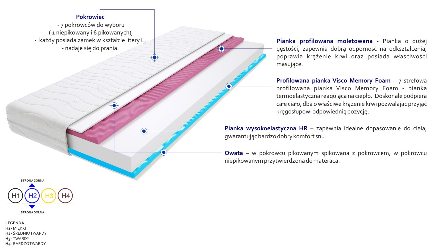 Filc, Pianka profilowana molet, Pianka profilowana Visco Memory, Pianka wysokoelastyczna HR, Pokrowiec, Włókno klimatyzujące