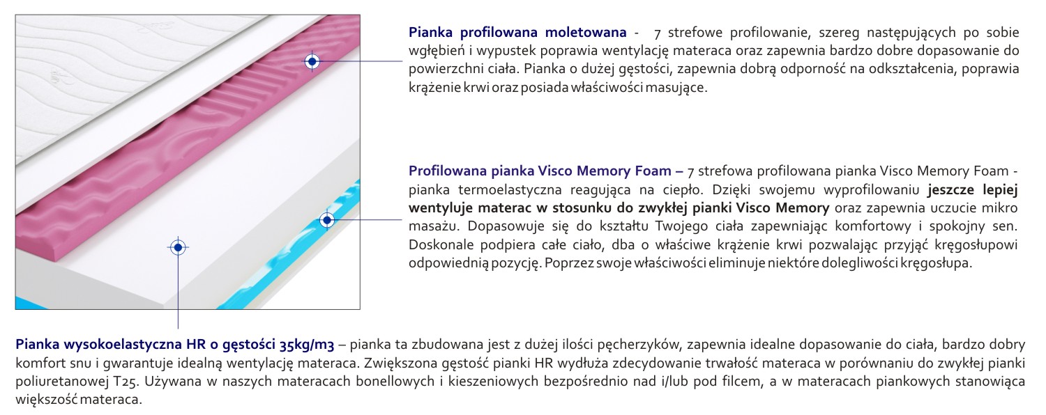 – inaczej zwana termopianką, teraz w wersji profilowanej – reagująca na temperaturę i nacisk. Im cieplej tym pianka staje się miększa, zmniejszanie się temperatury powoduje jej twardnienie. Pianka Visco Memory idealnie dopasowuje się do kształtu ciała , zapewnia odpowiednie podparcie kręgosłupa oraz właściwe krążenie krwi. W wersji profilowanej posiada właściwości mikromasujące. Jej zalety docenią szczególnie osoby z dolegliwościami kręgosłupa. Pamięć (memory) pianki Visco Memory to tzw. efekt wstawania pianki Visco. Kształt pianki dopasowuje się do kształtu naszego ciała, po zmianie naszej pozycji wraca do swoich normalnych parametrów, by po chwili dopasować się do nowej pozycji przybranej przez nasze ciało podczas snu.