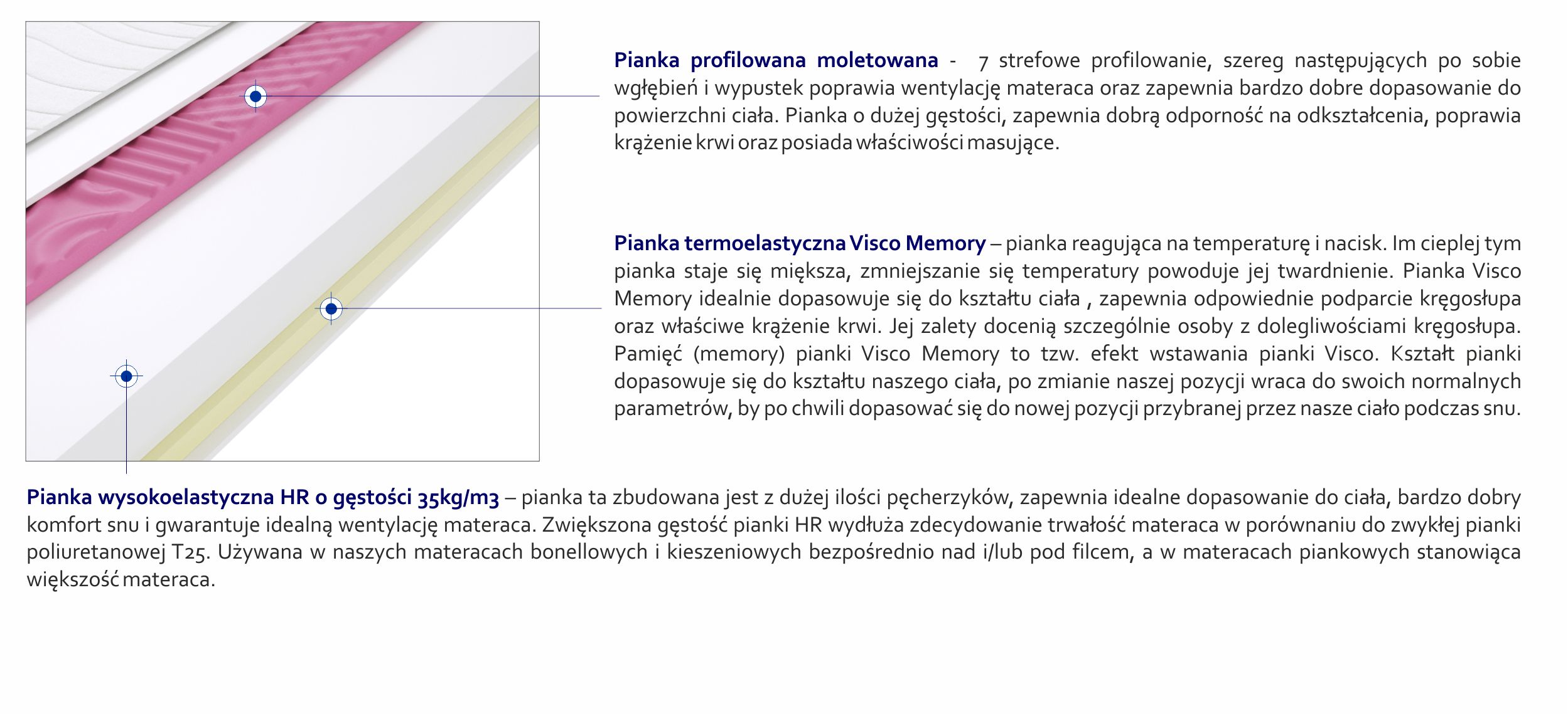– pianka reagująca na temperaturę i nacisk. Im cieplej tym pianka staje się miększa, zmniejszanie się temperatury powoduje jej twardnienie. Pianka Visco Memory idealnie dopasowuje się do kształtu ciała , zapewnia odpowiednie podparcie kręgosłupa oraz właściwe krążenie krwi. Jej zalety docenią szczególnie osoby z dolegliwościami kręgosłupa. Pamięć (memory) pianki Visco Memory to tzw. efekt wstawania pianki Visco. Kształt pianki dopasowuje się do kształtu naszego ciała, po zmianie naszej pozycji wraca do swoich normalnych parametrów, by po chwili dopasować się do nowej pozycji przybranej przez nasze ciało podczas snu.
