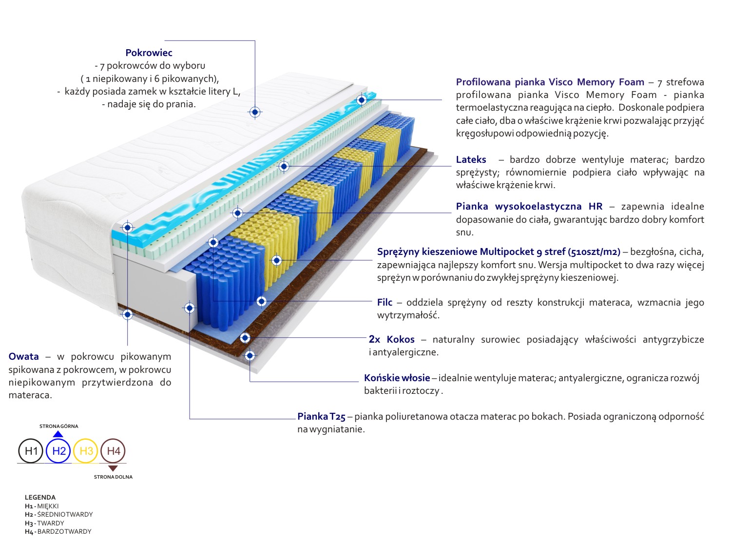 2x Kokos, Filc, Końskie Włosie, Lateks, Pianka profilowana Visco Memory, Pianka T25, Pianka wysokoelastyczna HR, Pokrowiec, Sprężyny kieszeniowe Multipocket, Włókno klimatyzujące
