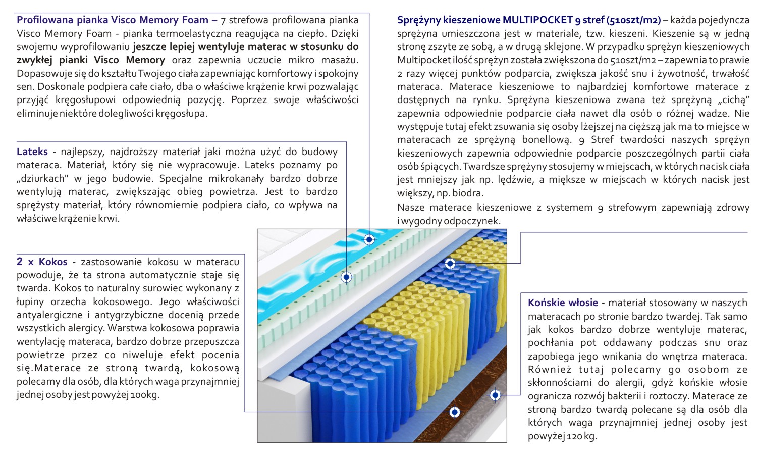 – każda pojedyncza sprężyna umieszczona jest w materiale, tzw. kieszeni. Kieszenie są w jedną stronę zszyte ze sobą, a w drugą sklejone. W przypadku sprężyn kieszeniowych Multipocket ilość sprężyn została zwiększona do 510szt/m2 – zapewnia to prawie 2 razy więcej punktów podparcia, zwiększa jakość snu i żywotność, trwałość materaca. Materace kieszeniowe to najbardziej komfortowe materace z dostępnych na rynku. Sprężyna kieszeniowa zwana też sprężyną „cichą” zapewnia odpowiednie podparcie ciała nawet dla osób o różnej wadze. Nie występuje tutaj efekt zsuwania się osoby lżejszej na cięższą jak ma to miejsce w materacach ze sprężyną bonellową. 9 Stref twardości naszych sprężyn kieszeniowych zapewnia odpowiednie podparcie poszczególnych partii ciała osób śpiących. Twardsze sprężyny stosujemy w miejscach, w których nacisk ciała jest mniejszy jak np. lędźwie, a miększe w miejscach w których nacisk jest większy, np. biodra.