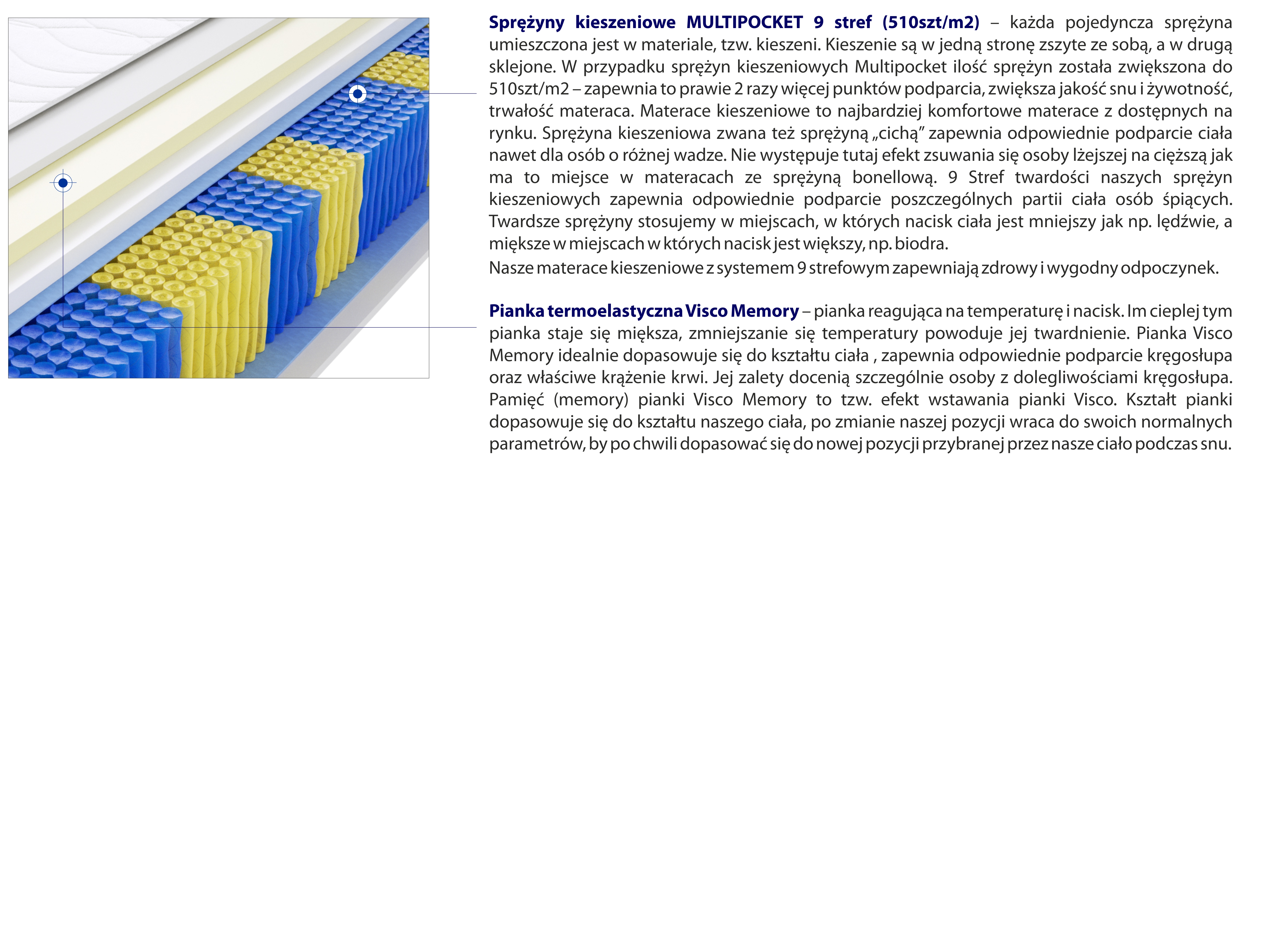 – każda pojedyncza sprężyna umieszczona jest w materiale, tzw. kieszeni. Kieszenie są w jedną stronę zszyte ze sobą, a w drugą sklejone. W przypadku sprężyn kieszeniowych Multipocket ilość sprężyn została zwiększona do 510szt/m2 – zapewnia to prawie 2 razy więcej punktów podparcia, zwiększa jakość snu i żywotność, trwałość materaca. Materace kieszeniowe to najbardziej komfortowe materace z dostępnych na rynku. Sprężyna kieszeniowa zwana też sprężyną „cichą” zapewnia odpowiednie podparcie ciała nawet dla osób o różnej wadze. Nie występuje tutaj efekt zsuwania się osoby lżejszej na cięższą jak ma to miejsce w materacach ze sprężyną bonellową. 9 Stref twardości naszych sprężyn kieszeniowych zapewnia odpowiednie podparcie poszczególnych partii ciała osób śpiących. Twardsze sprężyny stosujemy w miejscach, w których nacisk ciała jest mniejszy jak np. lędźwie, a miększe w miejscach w których nacisk jest większy, np. biodra.