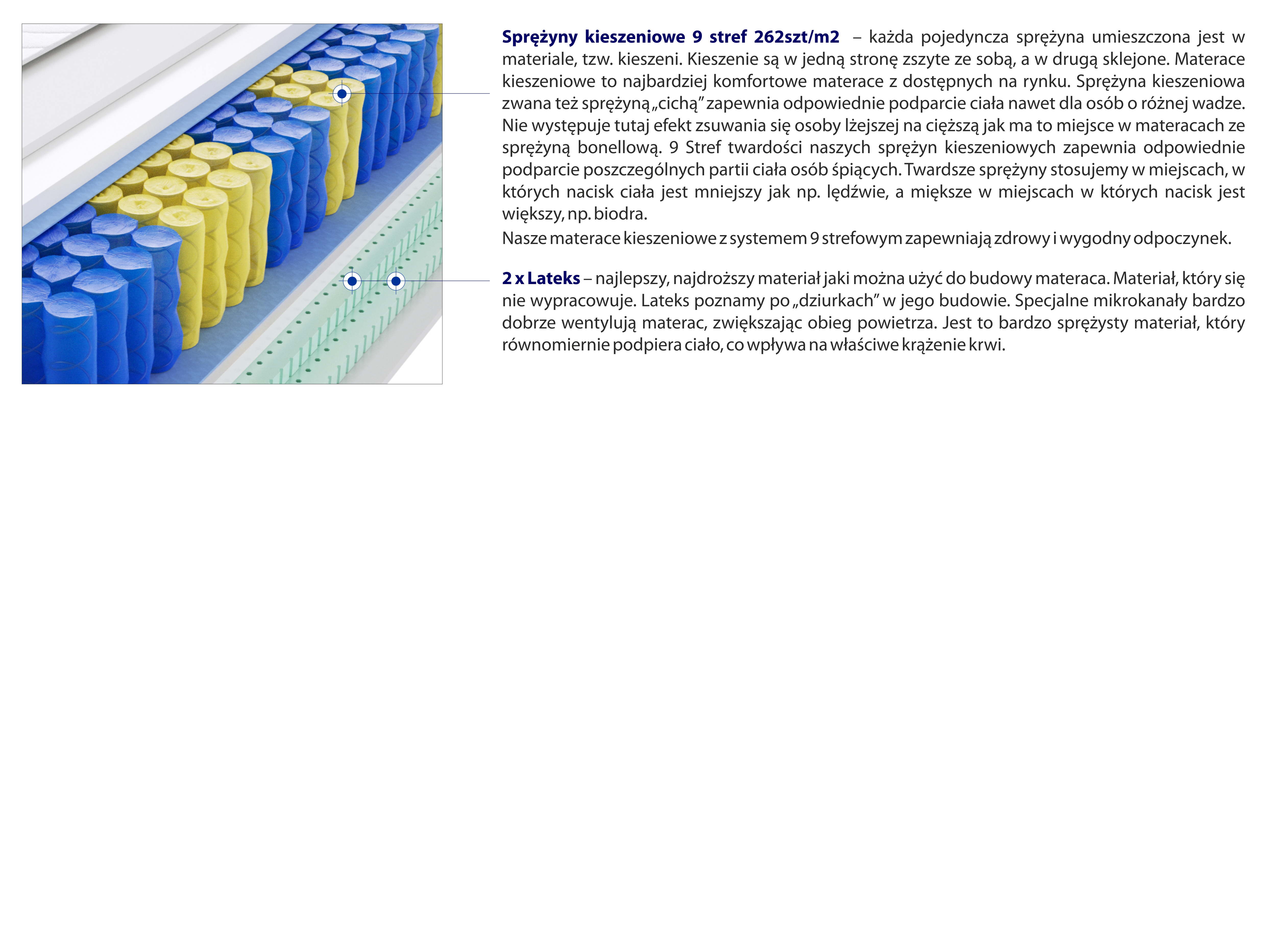 – każda pojedyncza sprężyna umieszczona jest w materiale, tzw. kieszeni. Kieszenie są w jedną stronę zszyte ze sobą, a w drugą sklejone. Materace kieszeniowe to najbardziej komfortowe materace z dostępnych na rynku. Sprężyna kieszeniowa zwana też sprężyną „cichą” zapewnia odpowiednie podparcie ciała nawet dla osób o różnej wadze. Nie występuje tutaj efekt zsuwania się osoby lżejszej na cięższą jak ma to miejsce w materacach ze sprężyną bonellową. 9 Stref twardości naszych sprężyn kieszeniowych zapewnia odpowiednie podparcie poszczególnych partii ciała osób śpiących. Twardsze sprężyny stosujemy w miejscach, w których nacisk ciała jest mniejszy jak np. lędźwie, a miększe w miejscach w których nacisk jest większy, np. biodra.