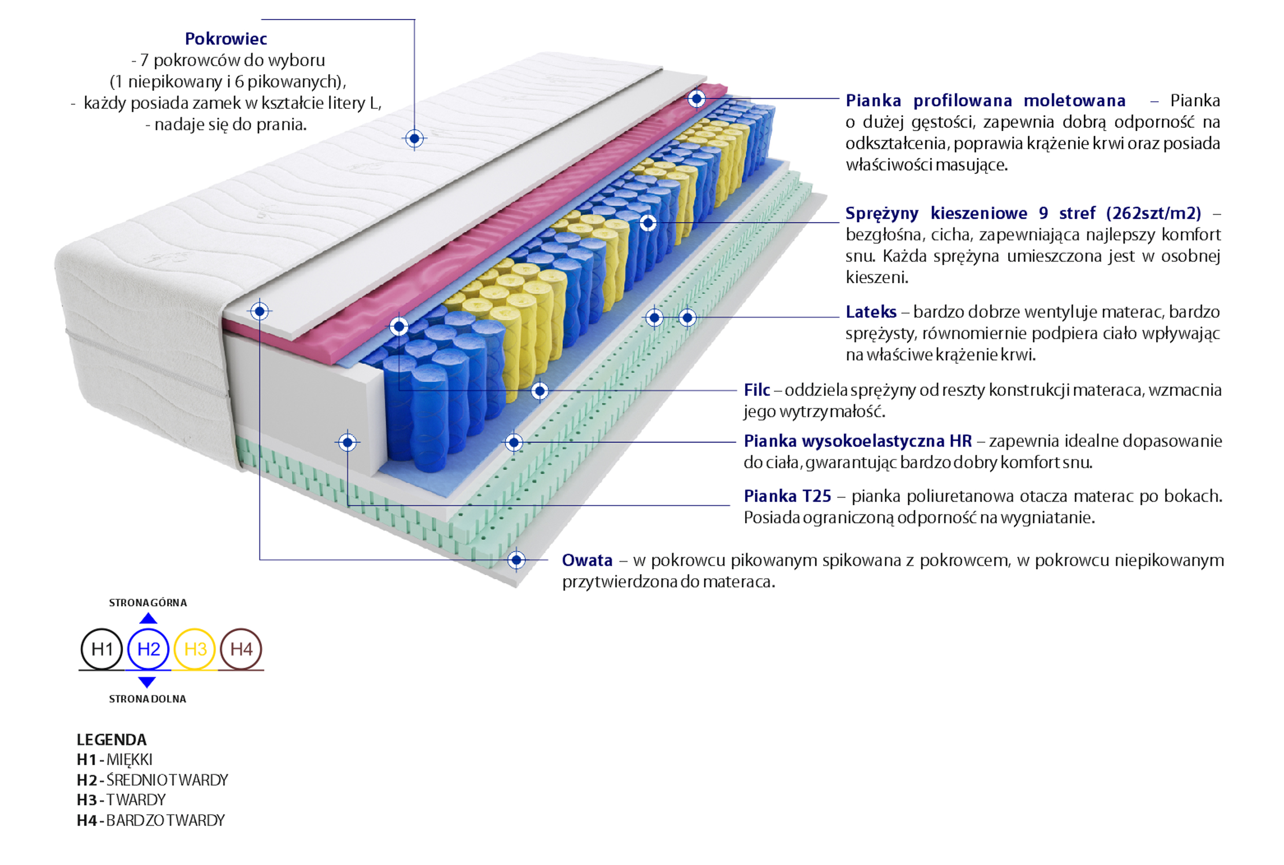 sprezyny-kieszeniowe, pianka-wysokoelastyczna-hr, pianka-profilowana-molet, 2x-lateks, pianka-t25, pokrowiec, filc, wlokno-klimatyzujace