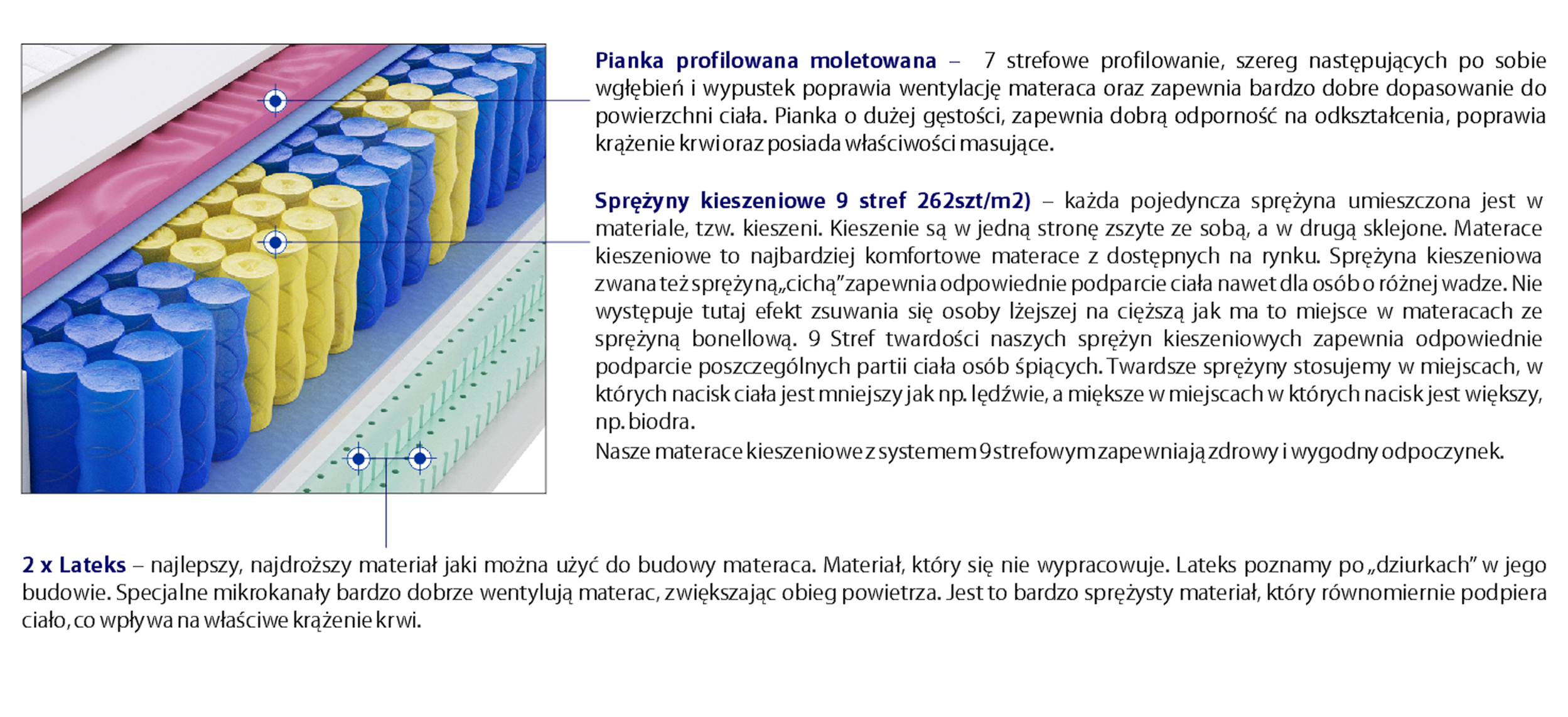 – każda pojedyncza sprężyna umieszczona jest w materiale, tzw. kieszeni. Kieszenie są w jedną stronę zszyte ze sobą, a w drugą sklejone. Materace kieszeniowe to najbardziej komfortowe materace z dostępnych na rynku. Sprężyna kieszeniowa zwana też sprężyną „cichą” zapewnia odpowiednie podparcie ciała nawet dla osób o różnej wadze. Nie występuje tutaj efekt zsuwania się osoby lżejszej na cięższą jak ma to miejsce w materacach ze sprężyną bonellową. 9 Stref twardości naszych sprężyn kieszeniowych zapewnia odpowiednie podparcie poszczególnych partii ciała osób śpiących. Twardsze sprężyny stosujemy w miejscach, w których nacisk ciała jest mniejszy jak np. lędźwie, a miększe w miejscach w których nacisk jest większy, np. biodra.