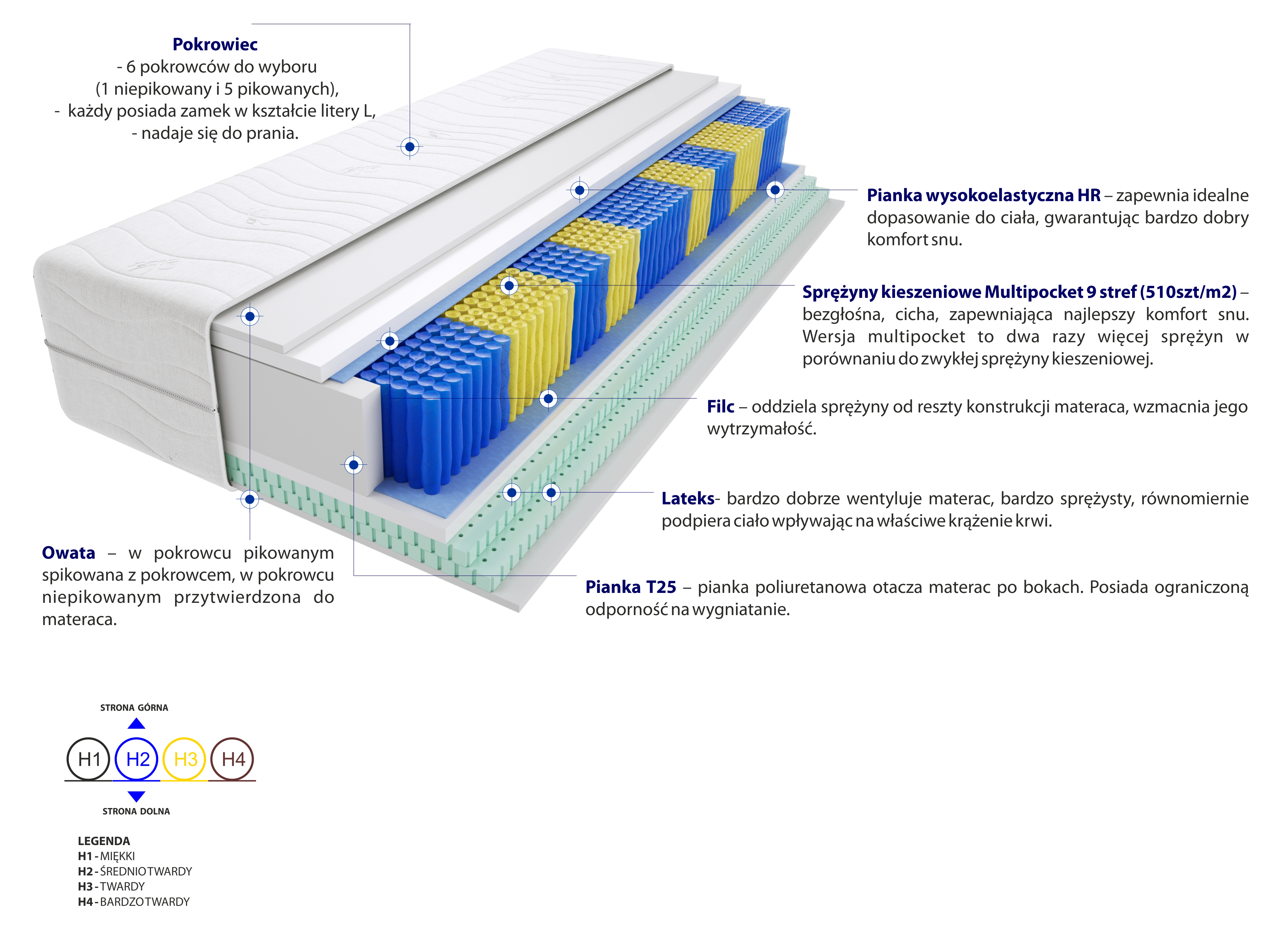 sprezyny-kieszeniowe-multipocket, pianka-wysokoelastyczna-hr, 2x-lateks, pianka-t25, pokrowiec, filc, wlokno-klimatyzujace