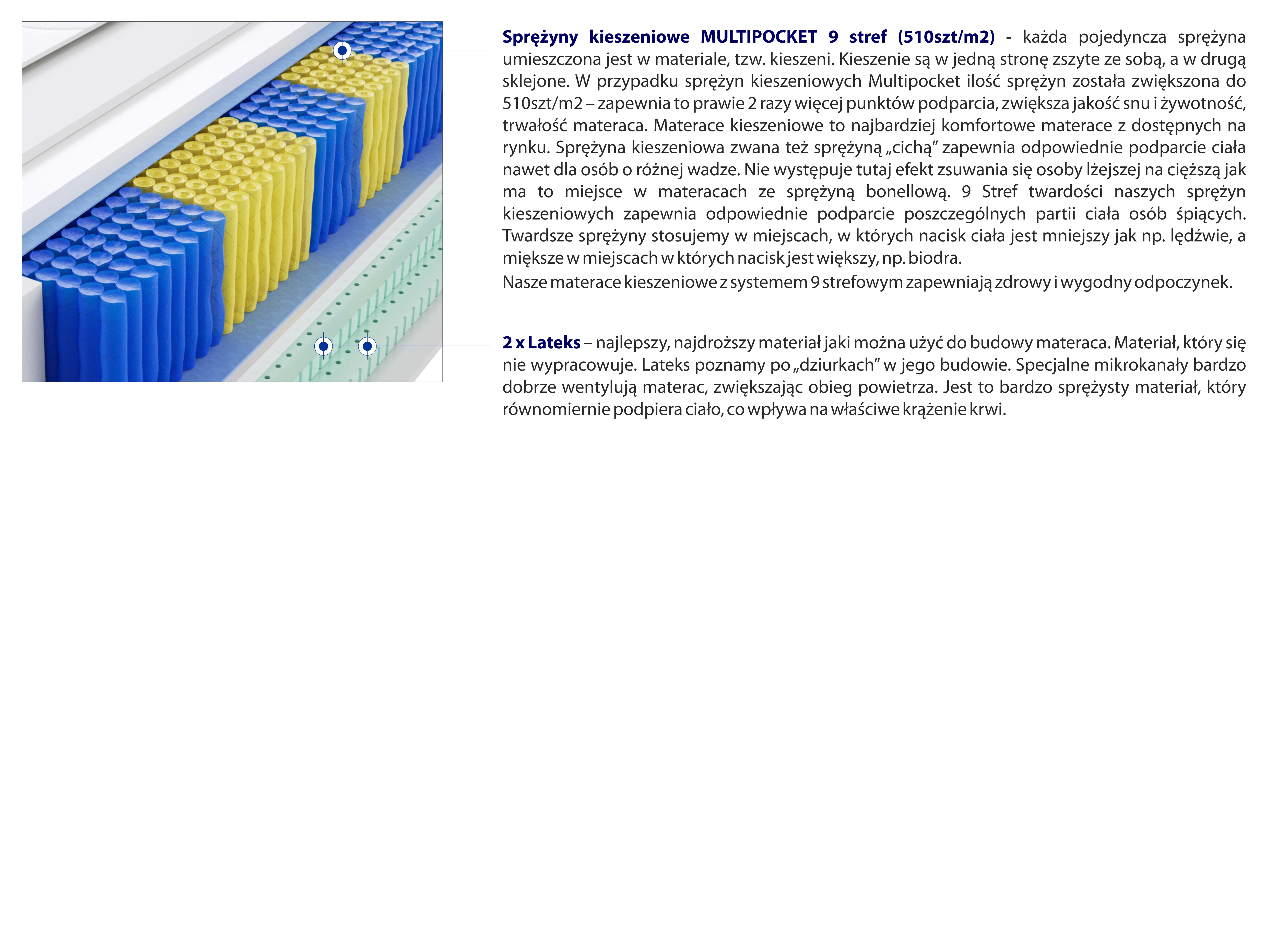 – każda pojedyncza sprężyna umieszczona jest w materiale, tzw. kieszeni. Kieszenie są w jedną stronę zszyte ze sobą, a w drugą sklejone. W przypadku sprężyn kieszeniowych Multipocket ilość sprężyn została zwiększona do 510szt/m2 – zapewnia to prawie 2 razy więcej punktów podparcia, zwiększa jakość snu i żywotność, trwałość materaca. Materace kieszeniowe to najbardziej komfortowe materace z dostępnych na rynku. Sprężyna kieszeniowa zwana też sprężyną „cichą” zapewnia odpowiednie podparcie ciała nawet dla osób o różnej wadze. Nie występuje tutaj efekt zsuwania się osoby lżejszej na cięższą jak ma to miejsce w materacach ze sprężyną bonellową. 9 Stref twardości naszych sprężyn kieszeniowych zapewnia odpowiednie podparcie poszczególnych partii ciała osób śpiących. Twardsze sprężyny stosujemy w miejscach, w których nacisk ciała jest mniejszy jak np. lędźwie, a miększe w miejscach w których nacisk jest większy, np. biodra.