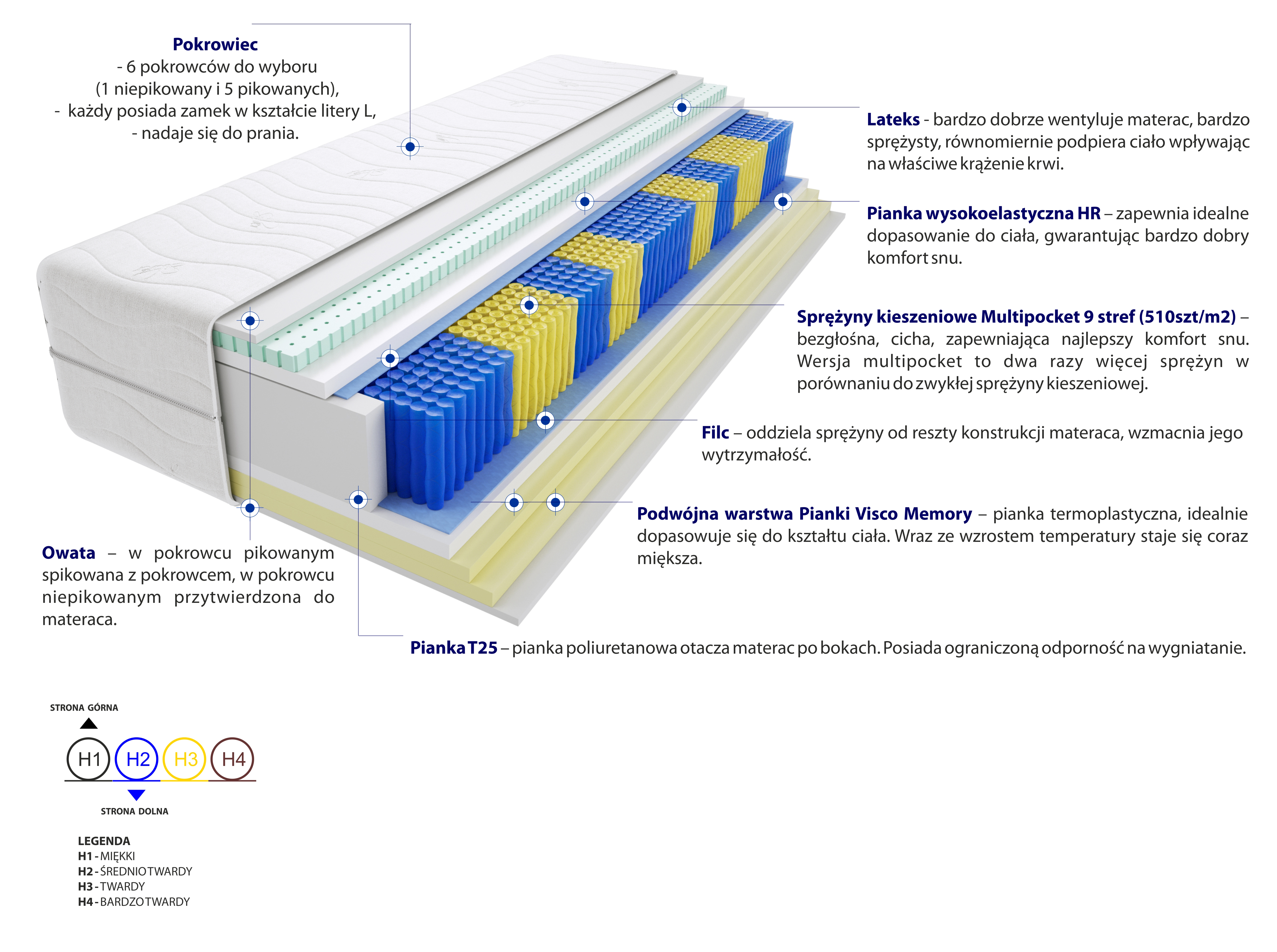 sprezyny-kieszeniowe-multipocket, pianka-wysokoelastyczna-hr, lateks, pianka-visco-memory, pianka-t25, pokrowiec, filc, wlokno-klimatyzujace