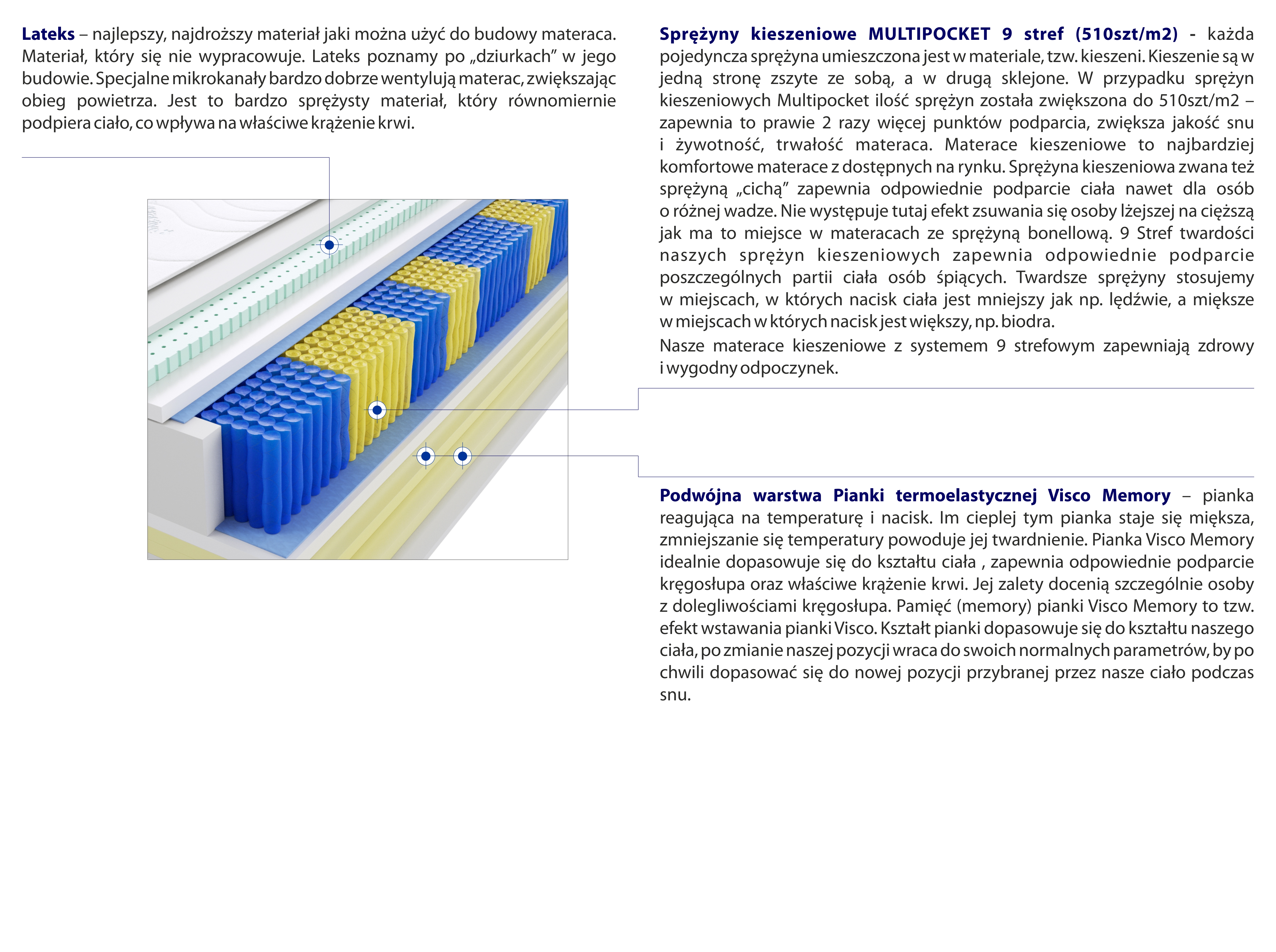 – każda pojedyncza sprężyna umieszczona jest w materiale, tzw. kieszeni. Kieszenie są w jedną stronę zszyte ze sobą, a w drugą sklejone. W przypadku sprężyn kieszeniowych Multipocket ilość sprężyn została zwiększona do 510szt/m2 – zapewnia to prawie 2 razy więcej punktów podparcia, zwiększa jakość snu i żywotność, trwałość materaca. Materace kieszeniowe to najbardziej komfortowe materace z dostępnych na rynku. Sprężyna kieszeniowa zwana też sprężyną „cichą” zapewnia odpowiednie podparcie ciała nawet dla osób o różnej wadze. Nie występuje tutaj efekt zsuwania się osoby lżejszej na cięższą jak ma to miejsce w materacach ze sprężyną bonellową. 9 Stref twardości naszych sprężyn kieszeniowych zapewnia odpowiednie podparcie poszczególnych partii ciała osób śpiących. Twardsze sprężyny stosujemy w miejscach, w których nacisk ciała jest mniejszy jak np. lędźwie, a miększe w miejscach w których nacisk jest większy, np. biodra.