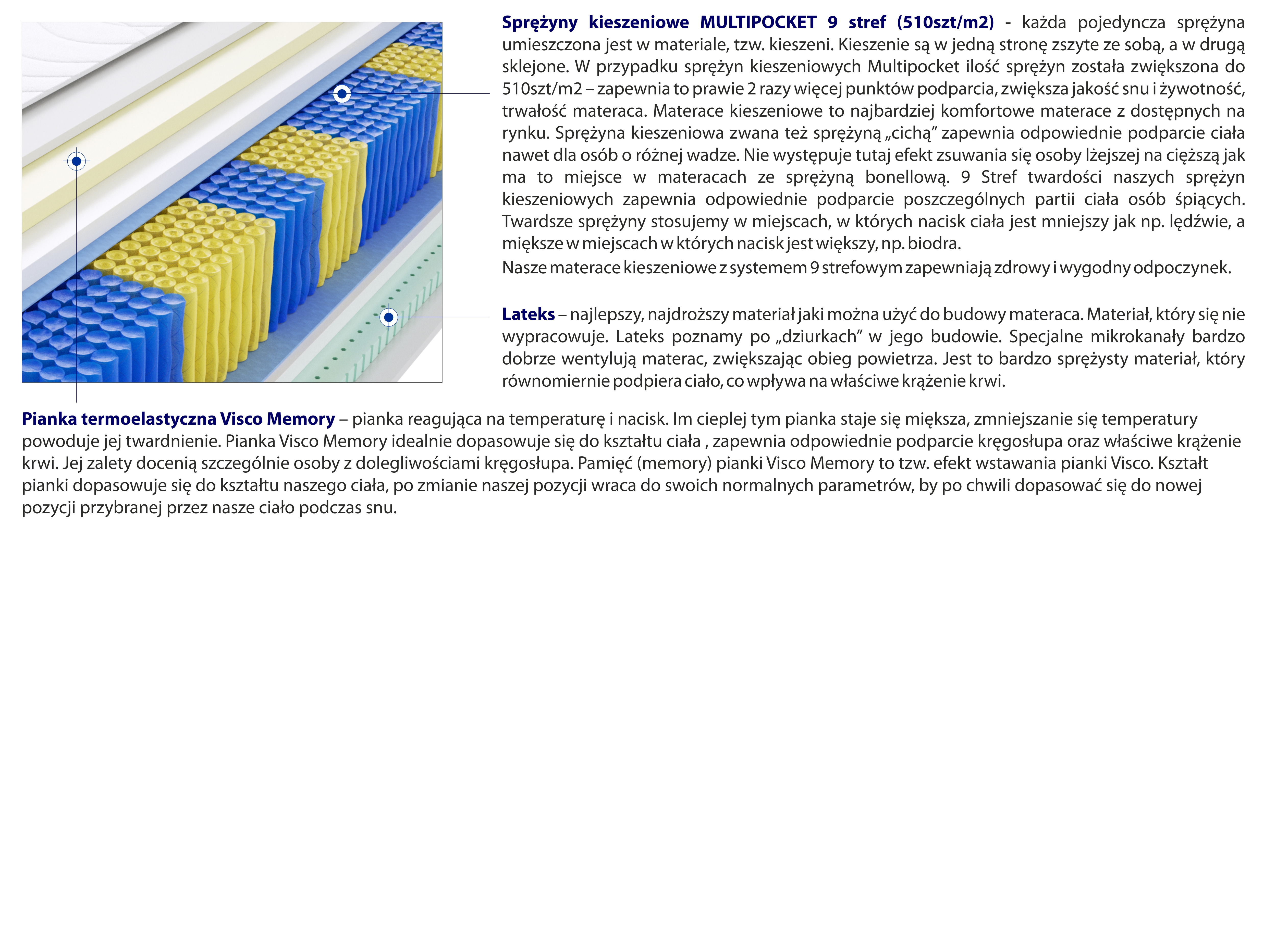 – każda pojedyncza sprężyna umieszczona jest w materiale, tzw. kieszeni. Kieszenie są w jedną stronę zszyte ze sobą, a w drugą sklejone. W przypadku sprężyn kieszeniowych Multipocket ilość sprężyn została zwiększona do 510szt/m2 – zapewnia to prawie 2 razy więcej punktów podparcia, zwiększa jakość snu i żywotność, trwałość materaca. Materace kieszeniowe to najbardziej komfortowe materace z dostępnych na rynku. Sprężyna kieszeniowa zwana też sprężyną „cichą” zapewnia odpowiednie podparcie ciała nawet dla osób o różnej wadze. Nie występuje tutaj efekt zsuwania się osoby lżejszej na cięższą jak ma to miejsce w materacach ze sprężyną bonellową. 9 Stref twardości naszych sprężyn kieszeniowych zapewnia odpowiednie podparcie poszczególnych partii ciała osób śpiących. Twardsze sprężyny stosujemy w miejscach, w których nacisk ciała jest mniejszy jak np. lędźwie, a miększe w miejscach w których nacisk jest większy, np. biodra.