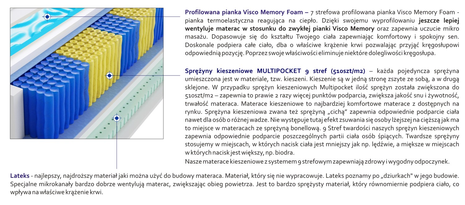 – każda pojedyncza sprężyna umieszczona jest w materiale, tzw. kieszeni. Kieszenie są w jedną stronę zszyte ze sobą, a w drugą sklejone. W przypadku sprężyn kieszeniowych Multipocket ilość sprężyn została zwiększona do 510szt/m2 – zapewnia to prawie 2 razy więcej punktów podparcia, zwiększa jakość snu i żywotność, trwałość materaca. Materace kieszeniowe to najbardziej komfortowe materace z dostępnych na rynku. Sprężyna kieszeniowa zwana też sprężyną „cichą” zapewnia odpowiednie podparcie ciała nawet dla osób o różnej wadze. Nie występuje tutaj efekt zsuwania się osoby lżejszej na cięższą jak ma to miejsce w materacach ze sprężyną bonellową. 9 Stref twardości naszych sprężyn kieszeniowych zapewnia odpowiednie podparcie poszczególnych partii ciała osób śpiących. Twardsze sprężyny stosujemy w miejscach, w których nacisk ciała jest mniejszy jak np. lędźwie, a miększe w miejscach w których nacisk jest większy, np. biodra. Nasze materace kieszeniowe z systemem 9 strefowym zapewniają zdrowy i wygodny odpoczynek.