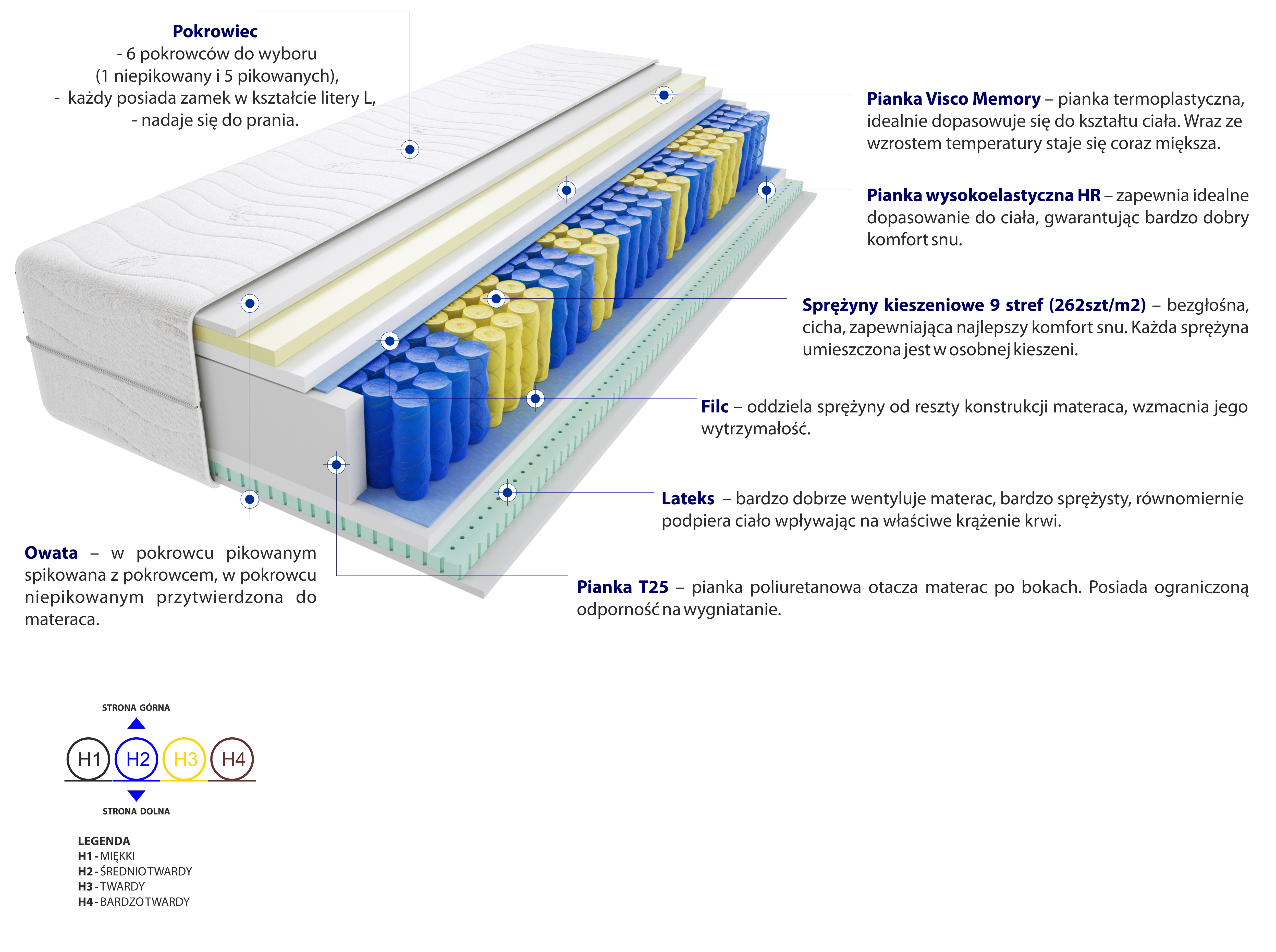 Filc, Lateks, Pianka T25, Pianka Visco Memory, Pianka wysokoelastyczna HR, Pokrowiec, Sprężyny kieszeniowe, Włókno klimatyzujące