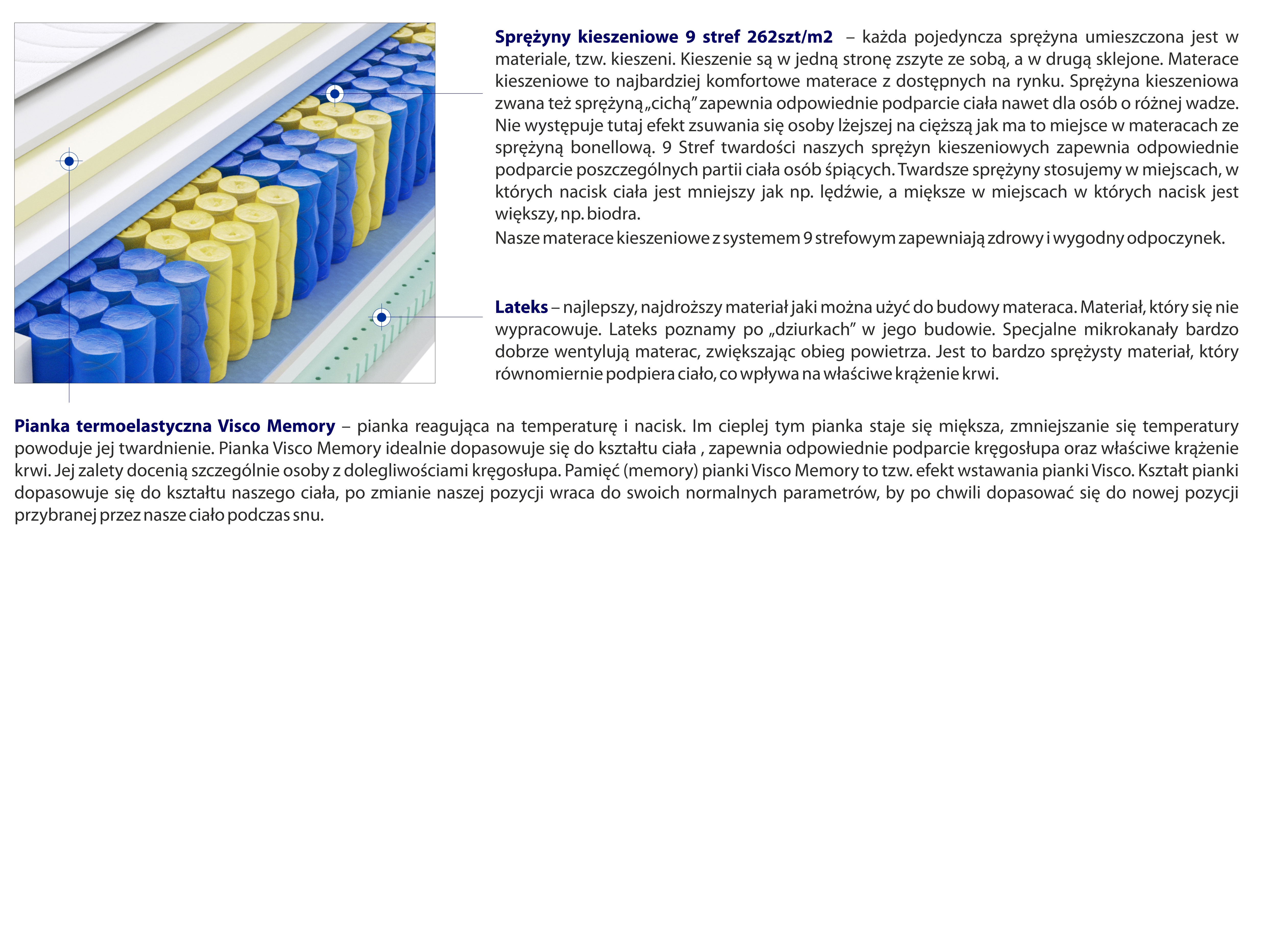 – każda pojedyncza sprężyna umieszczona jest w materiale, tzw. kieszeni. Kieszenie są w jedną stronę zszyte ze sobą, a w drugą sklejone. Materace kieszeniowe to najbardziej komfortowe materace z dostępnych na rynku. Sprężyna kieszeniowa zwana też sprężyną „cichą” zapewnia odpowiednie podparcie ciała nawet dla osób o różnej wadze. Nie występuje tutaj efekt zsuwania się osoby lżejszej na cięższą jak ma to miejsce w materacach ze sprężyną bonellową. 9 Stref twardości naszych sprężyn kieszeniowych zapewnia odpowiednie podparcie poszczególnych partii ciała osób śpiących. Twardsze sprężyny stosujemy w miejscach, w których nacisk ciała jest mniejszy jak np. lędźwie, a miększe w miejscach w których nacisk jest większy, np. biodra.